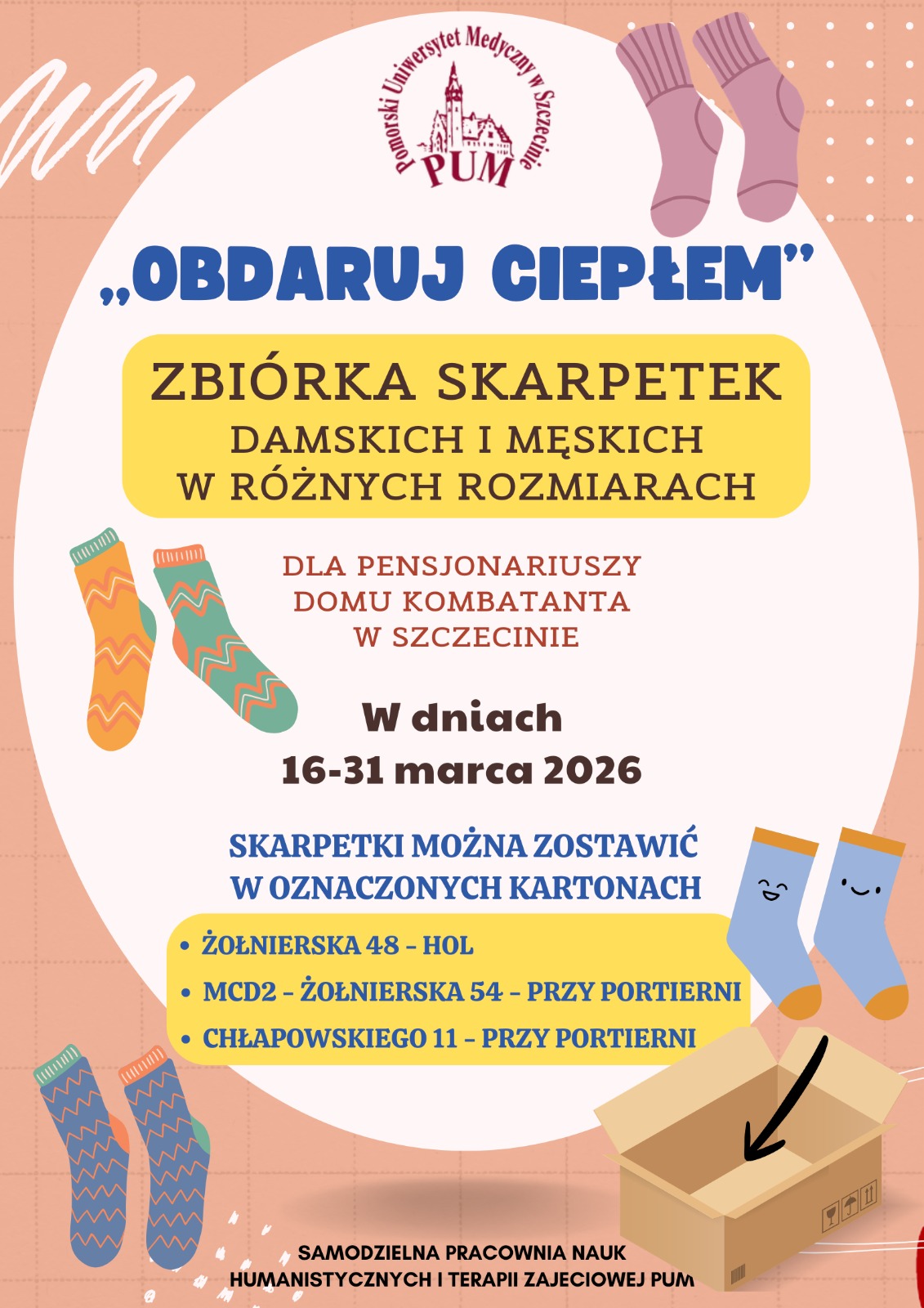 Zachęcamy do dołączenia do akcji i dostarczenia skarpetek w dniach 16-31.03.2026 do kartonów ustawionych w trzech lokalizacjach: