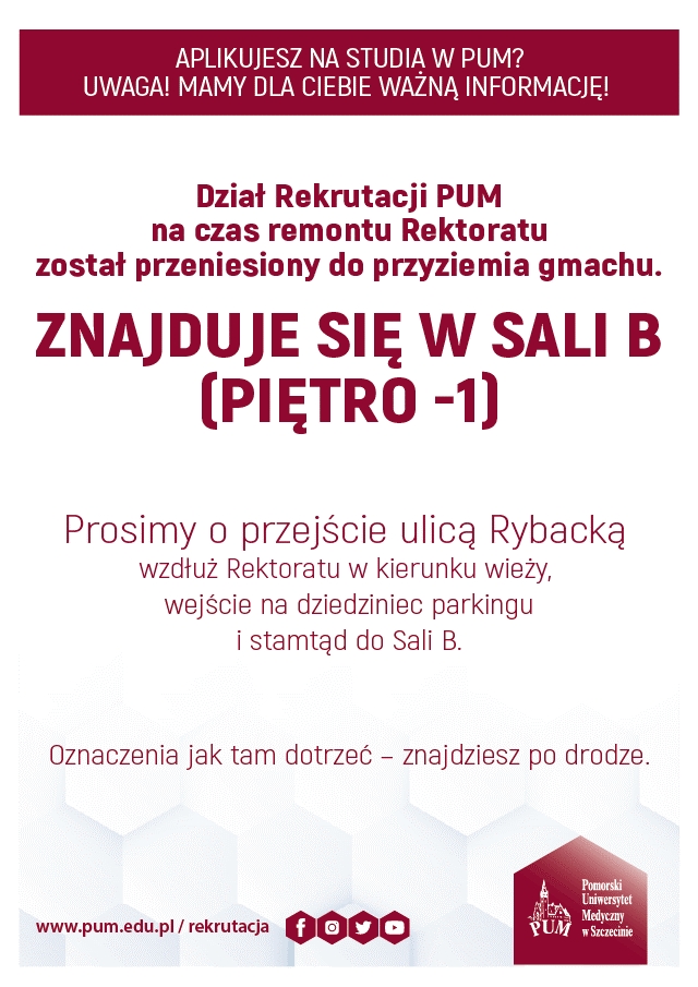 Przepraszamy za utrudnienia i zapraszamy Was do tymczasowego miejsca pracy od 3 sierpnia br. do odwołania. Z pracownikami działu można kontaktować się również telefonicznie i e-mailem w godzinach pracy, tj. od poniedziałku do piątku w godz. 8.00-14.00. T: +48 91 48 00 816 / 817 / 827, E-mail: rekrut@pum.edu.pl