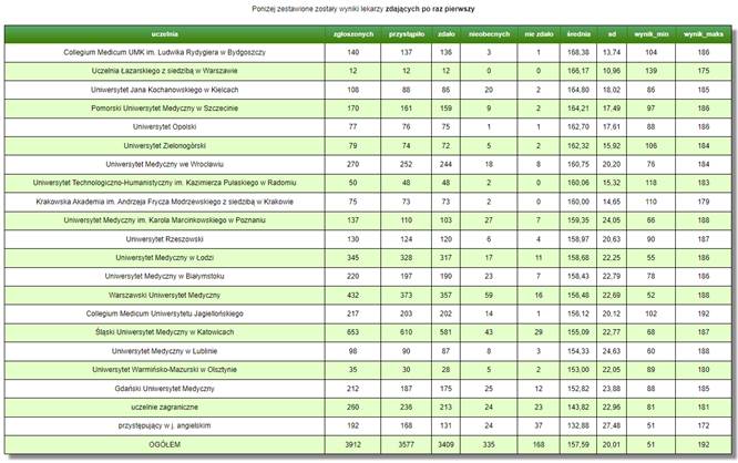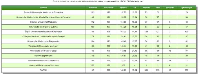 Dla podsumowania do Egzaminów Końcowych w tegorocznej sesji wiosennej przystąpiło 3577 lekarzy zdających egzamin po raz pierwszy, uzyskując średnio 157,59 punktów. Dla naszych absolwentów średnia uplasowała się na 164,8 punktach i maksymalnym uzyskanym wyniku w postaci 186 punktów. Natomiast do LDEK, wśród lekarzy dentystów zdających po raz pierwszy, przystąpiło 685 osób uzyskując średnio 148,28 punktów. Dla naszych studentów i absolwentów średnia zdobytej punktacji to 157,70 punktów, a maksymalna punktacja wyniosła 177 punktów.
