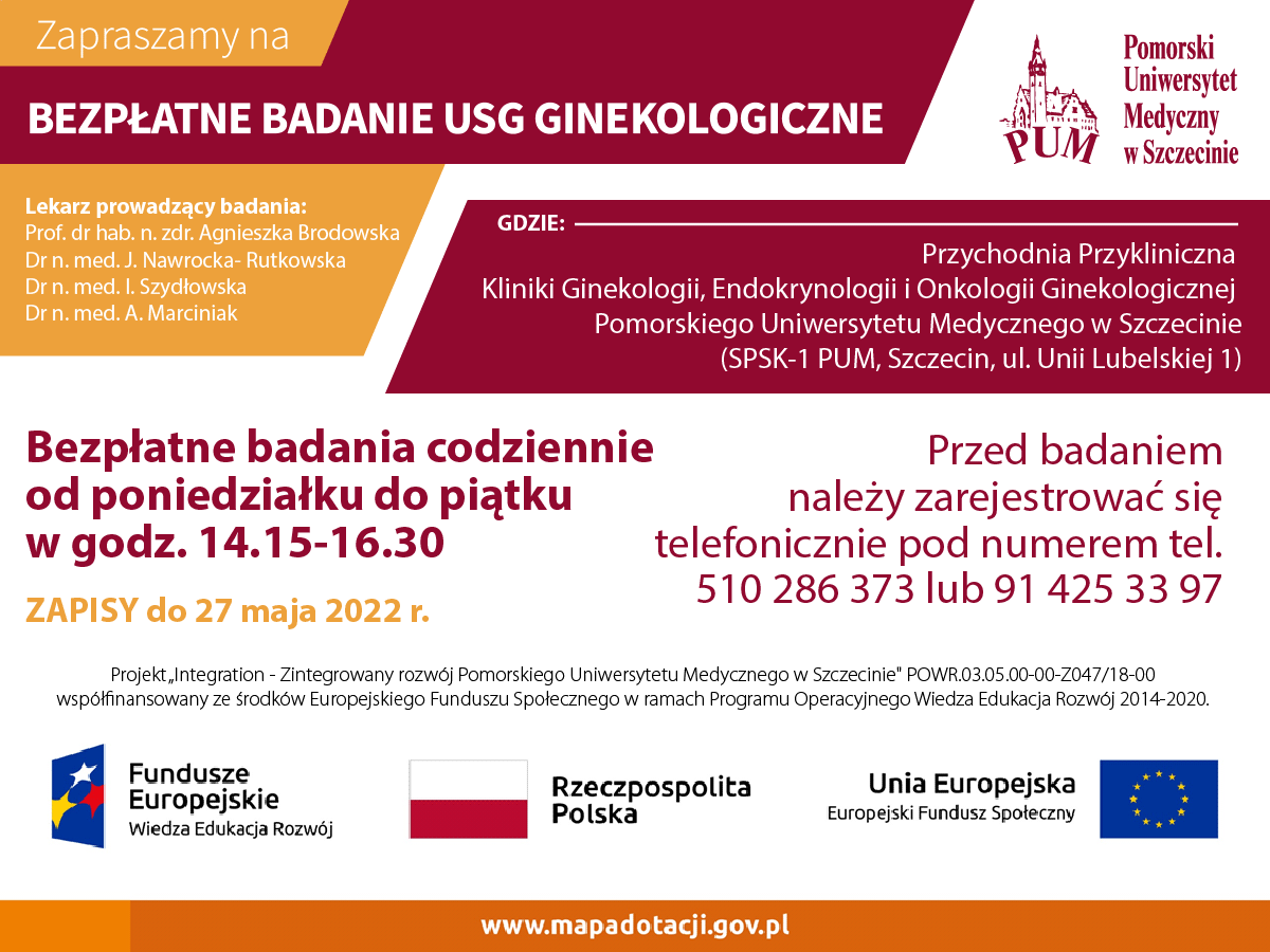 Przed badaniem należy zarejestrować się telefonicznie pod numerem tel. 510 286 373 lub 91 425 33 97.