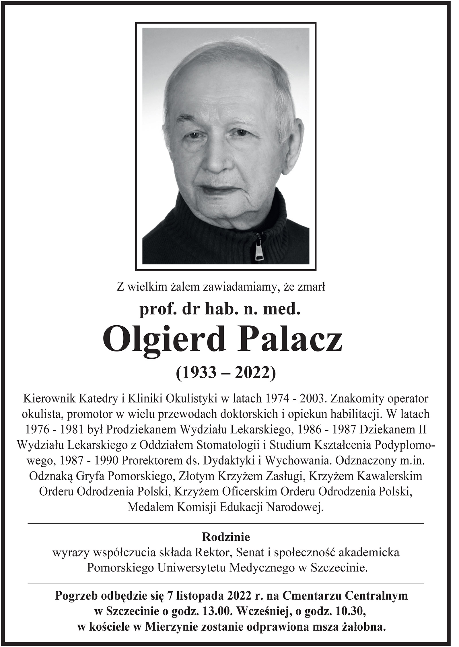 W wieku 89 lat zmarł profesor Olgierd Palacz. W latach 1974-2003 kierownik Katedry i Kliniki Okulistyki. Znakomity operator okulista, promotor w wielu przewodach doktorskich i opiekun habilitacji. W latach 1976-1981 był prodziekanem Wydziału Lekarskiego, dziekanem II Wydziału Lekarskiego z Oddziałem Stomatologii i Studium Kształcenia Podyplomowego, również prorektorem ds. Dydaktyki i Wychowania w latach 1987-1990. Odznaczony m.in. Odznaką Gryfa Pomorskiego, Złotym Krzyżem Zasługi, Krzyżem Kawalerskim Orderu Odrodzenia Polski, Krzyżem Oficerskim Orderu Odrodzenia Polski, Medalem Komisji Edukacji Narodowej.