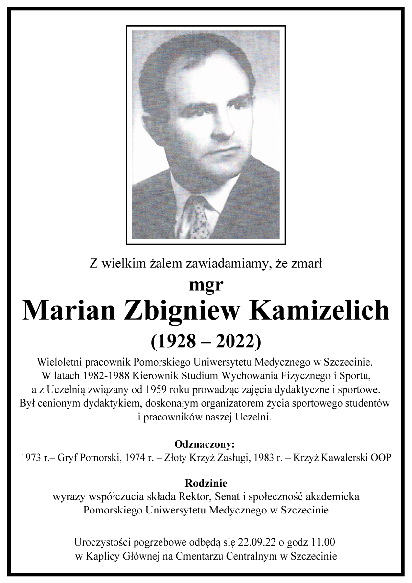 Zmarł mgr Marian Zbigniew Kamizelich, wieloletni pracownik Pomorskiego Uniwersytetu Medycznego w Szczecinie. W latach 1982-1988 Kierownik Studium Wychowania Fizycznego i Sportu, a z uczelnią związany od 1959 roku. Z pasją prowadził zajęcia dydaktyczne i sportowe, był cenionym dydaktykiem, doskonałym organizatorem życia sportowego studentów i pracowników naszej uczelni. Żegnamy z żalem …