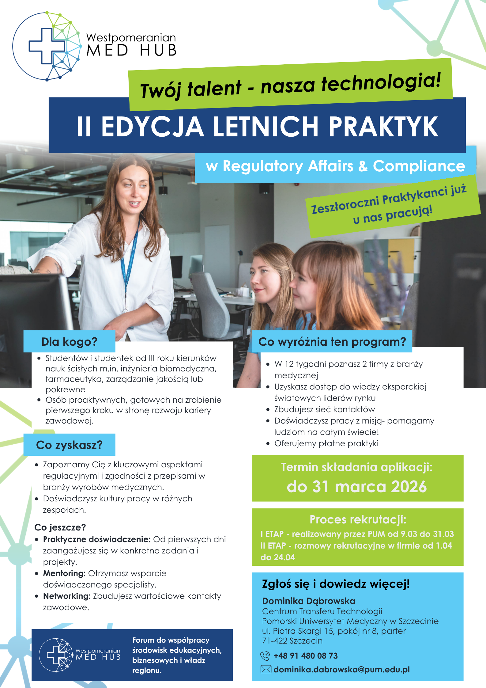 Zapraszamy studentów i studentki od III roku aktywnie planujących rozwój kariery zawodowej do udziału w II edycji programu Letnich Praktyk organizowanego przez West Pomeranian Med Hub.