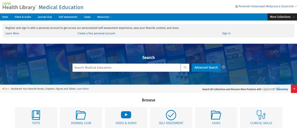 LWW Health Library-Medical Education to platforma, która zapewnia interaktywny dostęp online do podstawowych podręczników (min. Moore: Clinically Oriented Anatomy), filmów z procedurami, ilustracji, studiów przypadków i banków quizów specjalnie dostosowanych do poszczególnych specjalności. Jest źródłem sprawdzonych treści z zakresu edukacji medycznej, nauk o zdrowiu i medycyny klinicznej, przeznaczonym dla studentów, wykładowców i klinicystów.