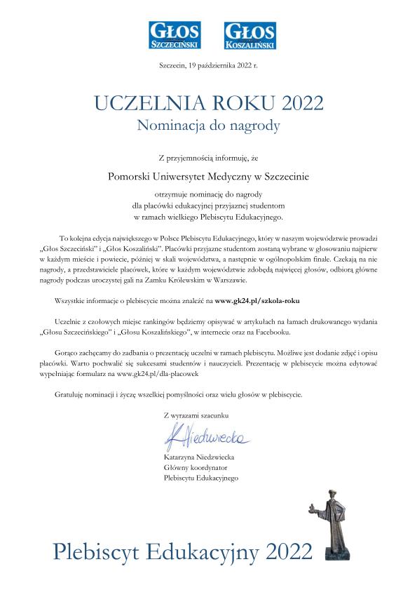 Miło nam Państwa poinformować, że głosami studentów Pomorski Uniwersytet Medyczny w Szczecinie został nominowany w Plebiscycie Edukacyjnym do nagrody „Uczelnia Roku”.