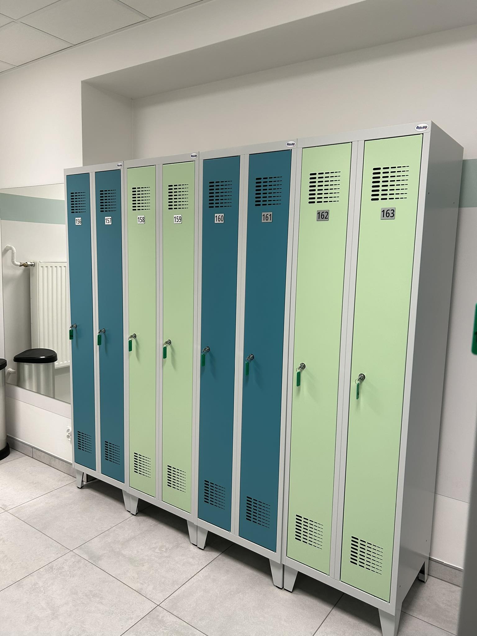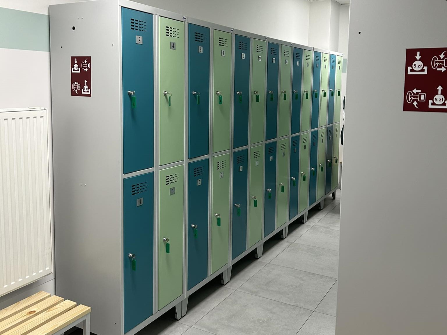 W pomieszczeniu zastosowano nowoczesną kontrolę dostępu przy użyciu legitymacji studenckiej, zgodnie ze standardami uczelni. Wymieniono oświetlenie na ekonomiczne, ledowe oraz zastosowano nowość - czujnik obecności osoby w pomieszczeniu (nie mylić z czujnikiem ruchu), co podnosi komfort użytkowania przez studentów. Szatnia wyposażona jest w 172 szafki, ławki do siedzenia i do zmiany obuwia, funkcjonalny stolik socjalny, przebieralnie 2 kabinową, lustro oraz pojemniki na odpady segregowalne. Szatnia utrzymana jest w bardzo modnej i ponadczasowej kolorystyce kojarzącej się z naturą i wszystkim tym, czym obdarowywuje nas matka ziemia. Kolory ziemi sprawiają że łatwiej jest się studentom wyciszyć i skupić. Dzięki zastosowanej kolorystyce wnętrze robi się eleganckie, pełne przytulności i ciepła.