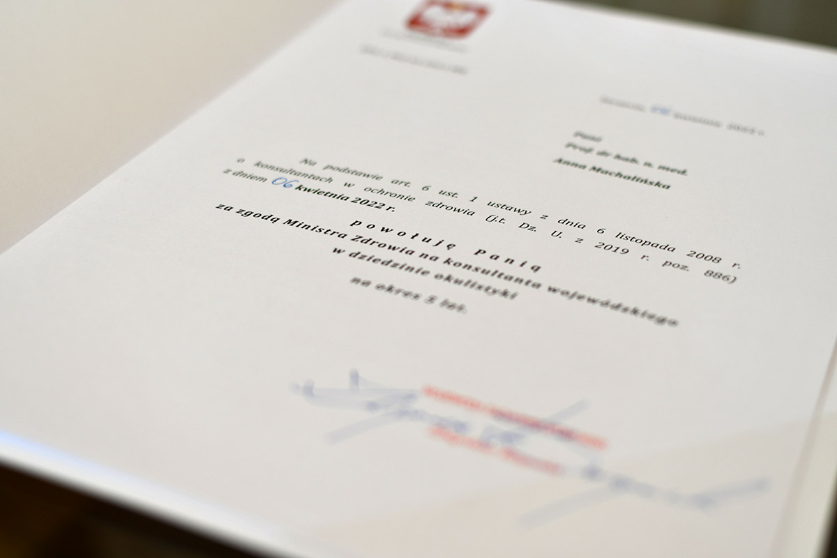Na początku kwietnia br. nową konsultantką wojewódzką w dziedzinie okulistyki została prof. Anna Machalińska, kierownik I Katedry i Kliniki Okulistyki Pomorskiego Uniwersytetu Medycznego w Szczecinie.
