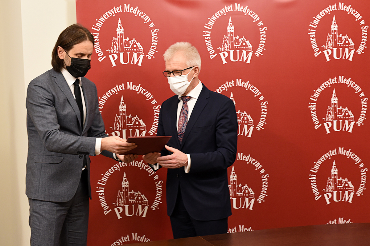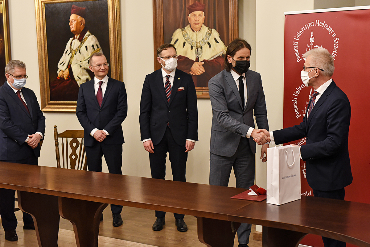 Prof. dr hab. n. med. Jarosław Kaźmierczak został wyróżniony odznaką honorową „Za zasługi dla Ochrony Zdrowia”. Wręczył ją Wiceminister Zdrowia Piotr Bromber w obecności Wojewody Zachodniopomorskiego Zbigniewa Boguckiego, Posła na Sejm RP Czesława Hoca oraz prof. Bogusława Machalińskiego, rektora PUM i prof. Jerzego Samochowca, prorektora ds. nauki PUM.