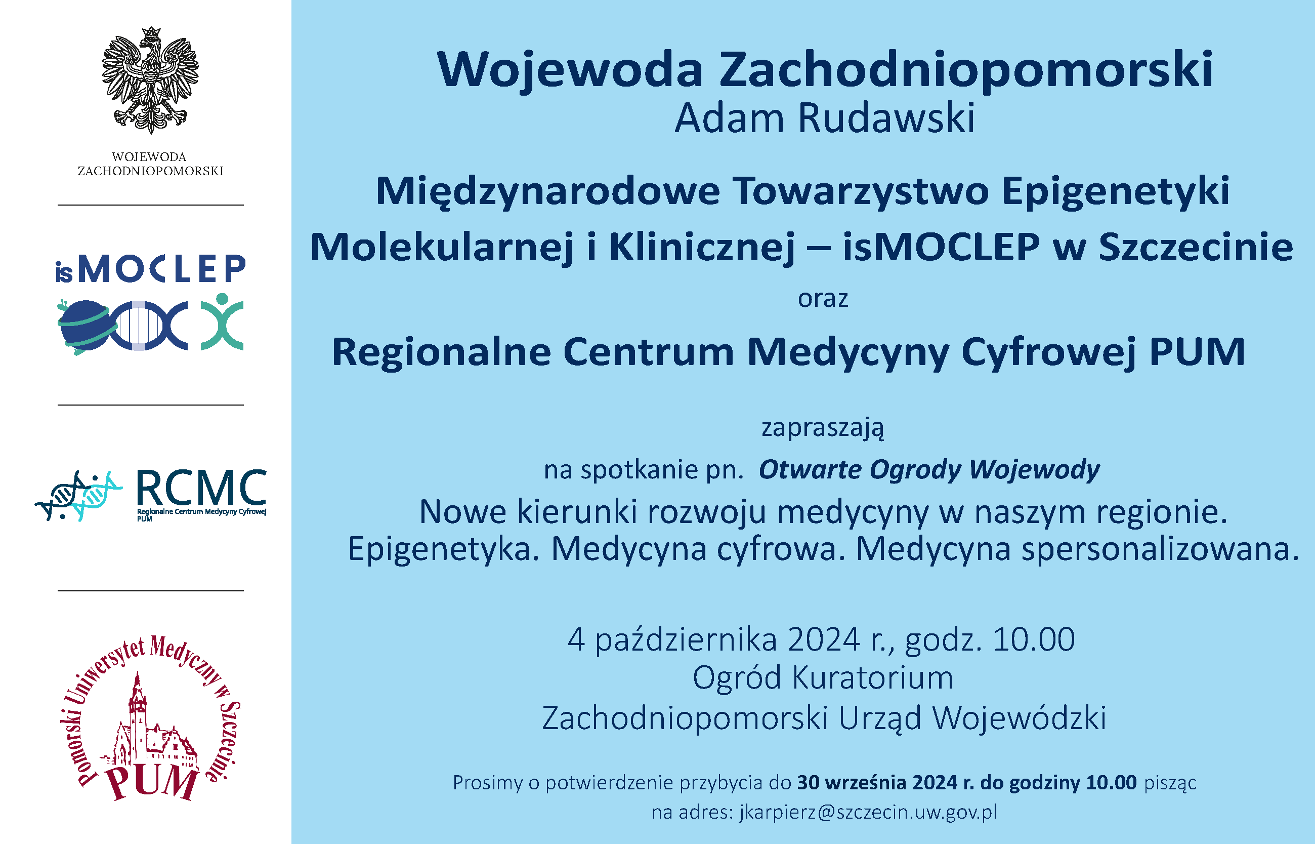 Wojewoda Zachodniopomorski Adam Rudawski, Międzynarodowe Towarzystwo Epigenetyki Molekularnej i Klinicznej (IsMOCLEP) oraz Regionalne Centrum Medycyny Cyfrowej PUM, mają zaszczyt zaprosić Państwa na pierwsze spotkanie w ramach Cyklu-"Otwarte Ogrody Wojewody".