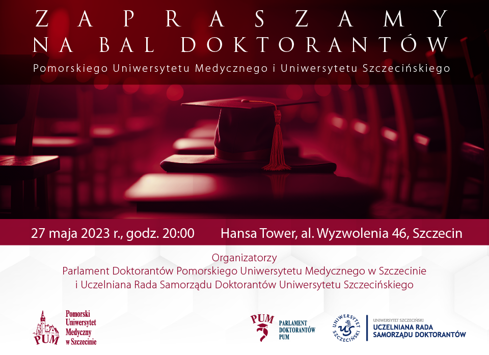 Parlament Doktorantów Pomorskiego Uniwersytetu Medycznego w Szczecinie wraz z Uczelnianą Radą Samorządu Doktorantów Uniwersytetu Szczecińskiego mają zaszczyt zaprosić na 1. Bal Doktorantów PUM i US - absolwentów Szkoły Doktorskiej i Studiów Doktoranckich, doktorantów, którzy obronili prace albo zakończyli tę ścieżkę studiów.