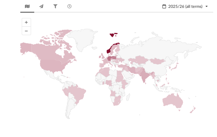 Na mapie dominują trzy kraje: Norwegia, Niemcy i Polska – to właśnie z tych państw pochodzi największa liczba aplikacji. Szczególnie intensywne zabarwienie wskazuje na wysokie zainteresowanie kandydatów z Norwegii i Niemiec, które tradycyjnie należą do liderów wśród zagranicznych aplikantów na naszej uczelni.