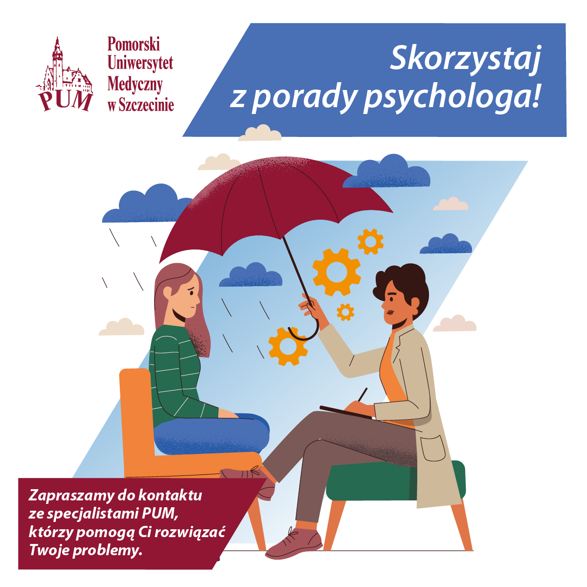 - Umów się telefonicznie z psycholog mgr Joanną Chachulską. Kontakt od poniedziałku do piątku pod numerem +48 722 191 021 lub e-mailem: joanna.chachulska@pum.edu.pl