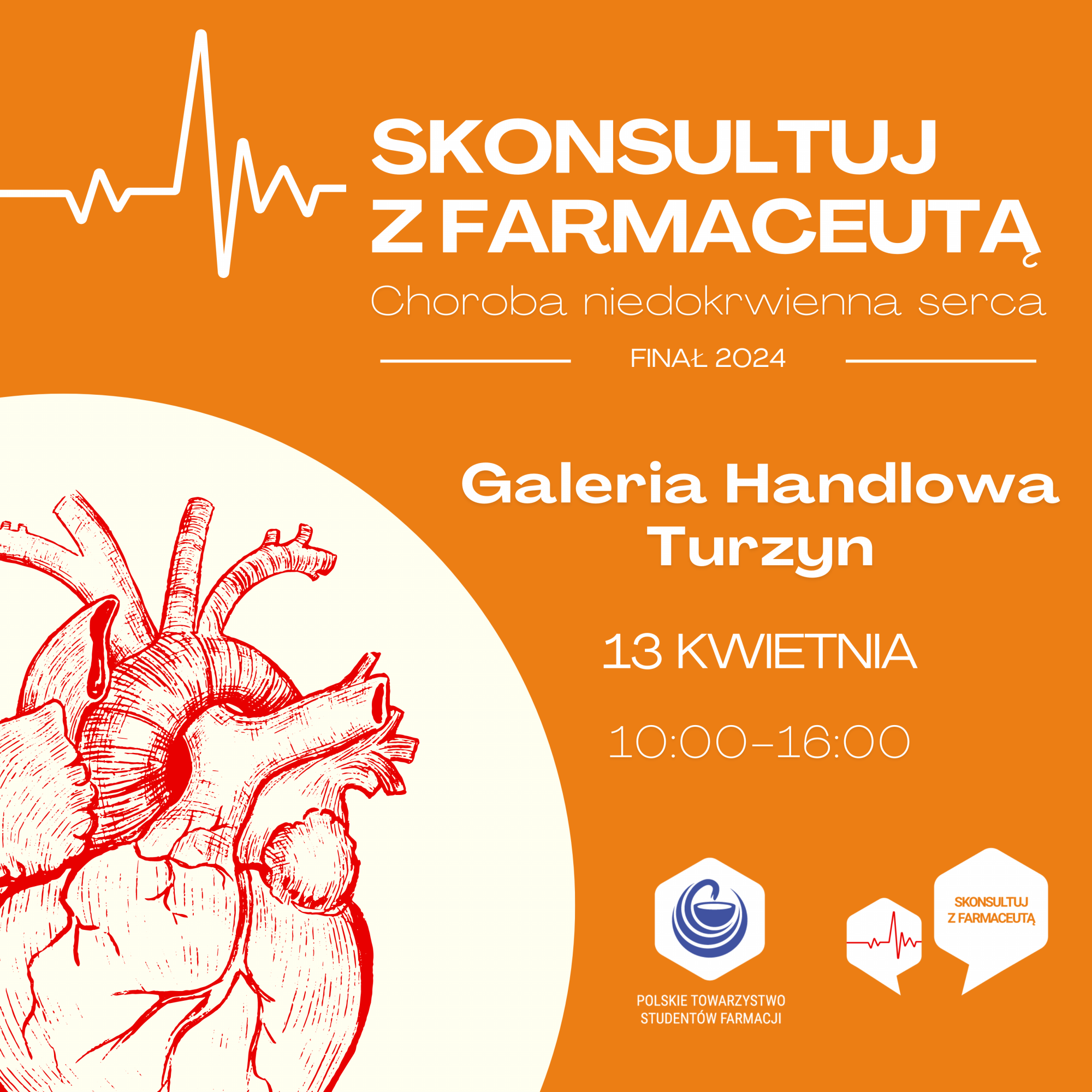 “Skonsultuj z Farmaceutą” to akcja edukacyjna Polskiego Towarzystwa Studentów Farmacji, która ma na celu zwiększenie świadomości społeczeństwa na temat profilaktyki wielu chorób. Najbliższa edycja odbędzie się w dniach 08-13.04.2024 r. i będzie skupiać się właśnie na chorobie niedokrwiennej serca.