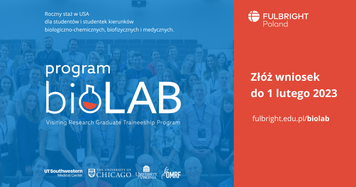 Informujemy, że ruszył nabór do Programu BioLAB 2023-24. To program, który umożliwia odbycie studentom i studentkom studiów magisterskich oraz doktoranckich nauk biologiczno-chemicznych i medycznych rocznego stażu badawczego w laboratorium znajdującym się w jednej z czterech instytucji w USA.