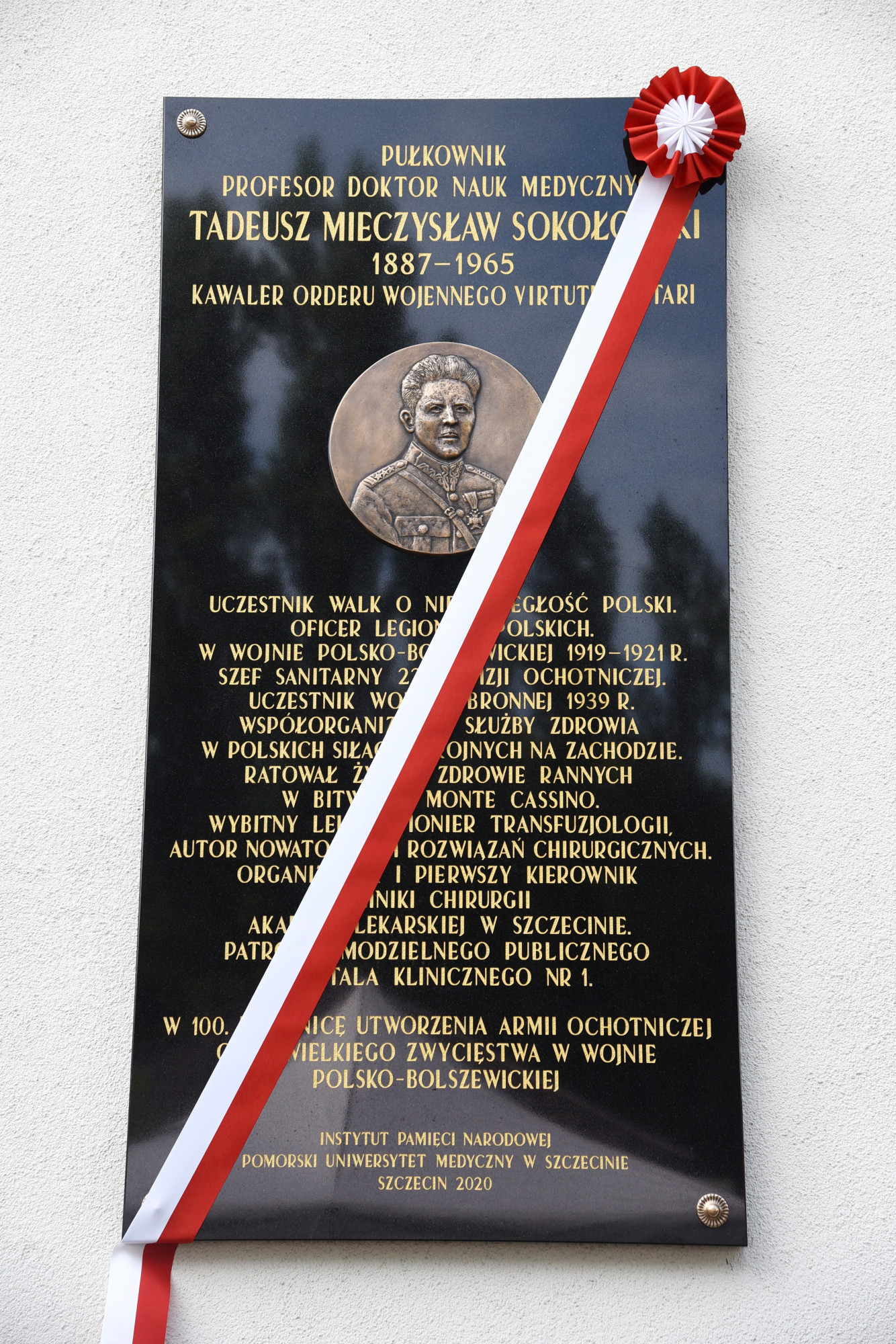 Tablica ufundowana została przez Instytut Pamięci Narodowej z okazji setnej rocznicy zwycięstwa nad bolszewikami w wojnie z 1920 roku i usytuowana jest na frontowej ścianie budynku przy wejściu głównym do szpitala przy Unii Lubelskiej. Grób prof. Tadeusza Sokołowskiego znajduje się na Cmentarzu Centralnym w Szczecinie (kwatera 37B, rząd 2, grób 4).