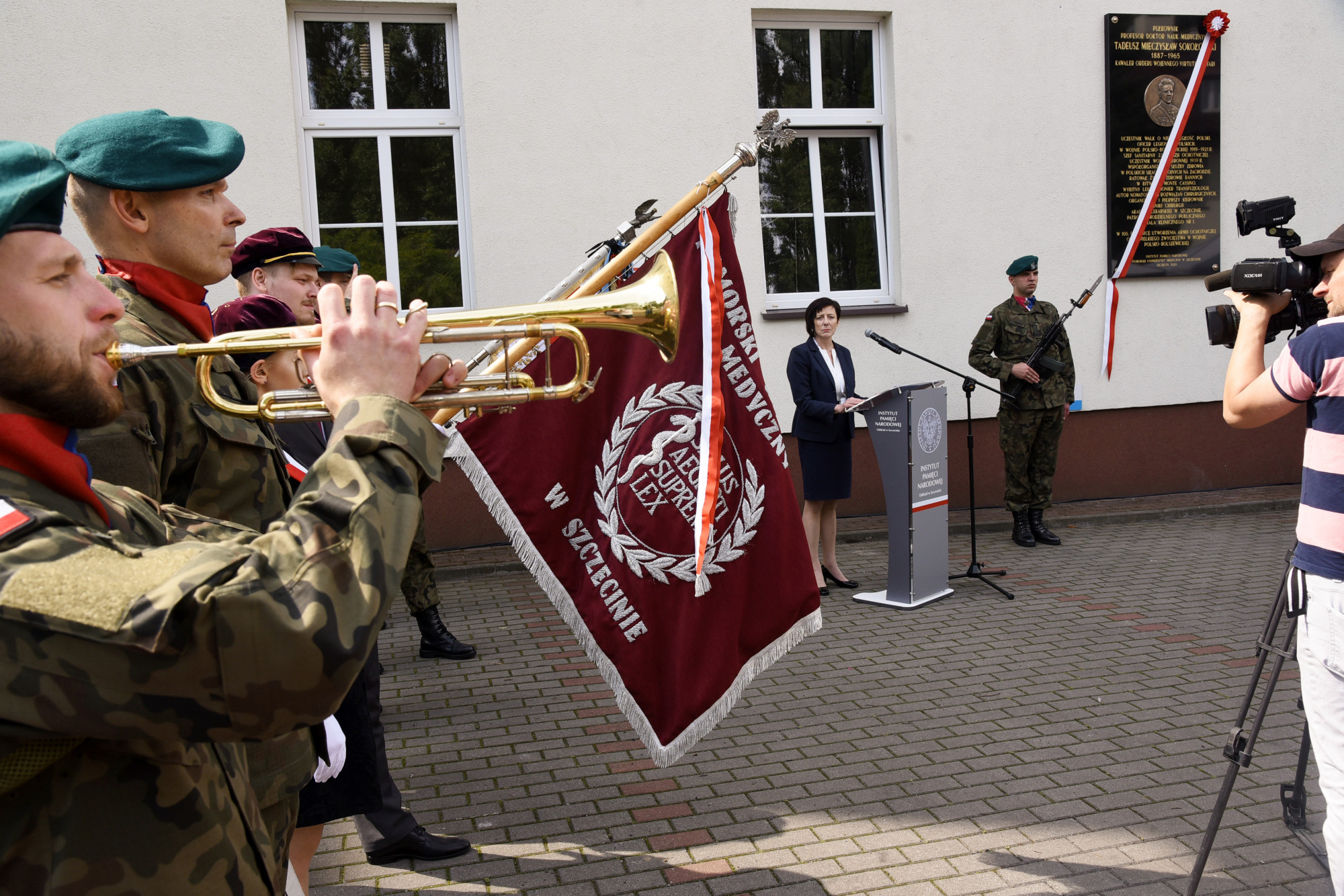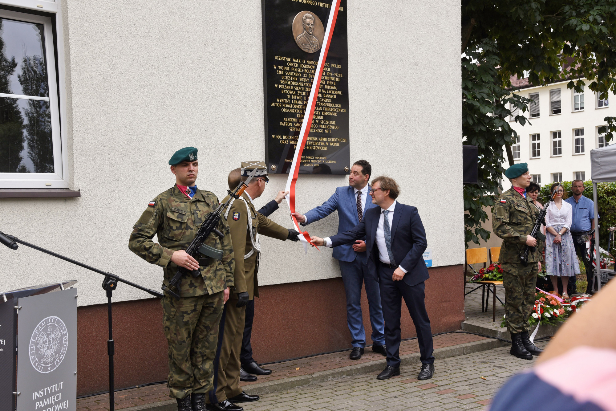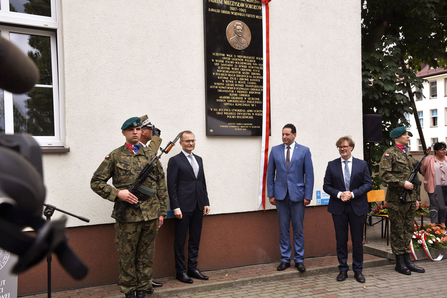W asyście wojskowej i pocztu sztandarowego PUM, wczoraj uroczyście odsłonili tablicę pamiątkową płk. prof. Tadeusza Sokołowskiego, patrona Samodzielnego Publicznego Szpitala Klinicznego Nr 1 Pomorskiego Uniwersytetu Medycznego w Szczecinie - dyrektor IPN O/Szczecin Paweł Skubisz, Generał brygady Jacek Ostrowski, Zastępca Dowódcy - Szef Sztabu 12. Szczecińskiej dywizji Zmechanizowanej oraz rektor PUM prof. Bogusław Machaliński i dyrektor szpitala dr Konrad Jarosz.