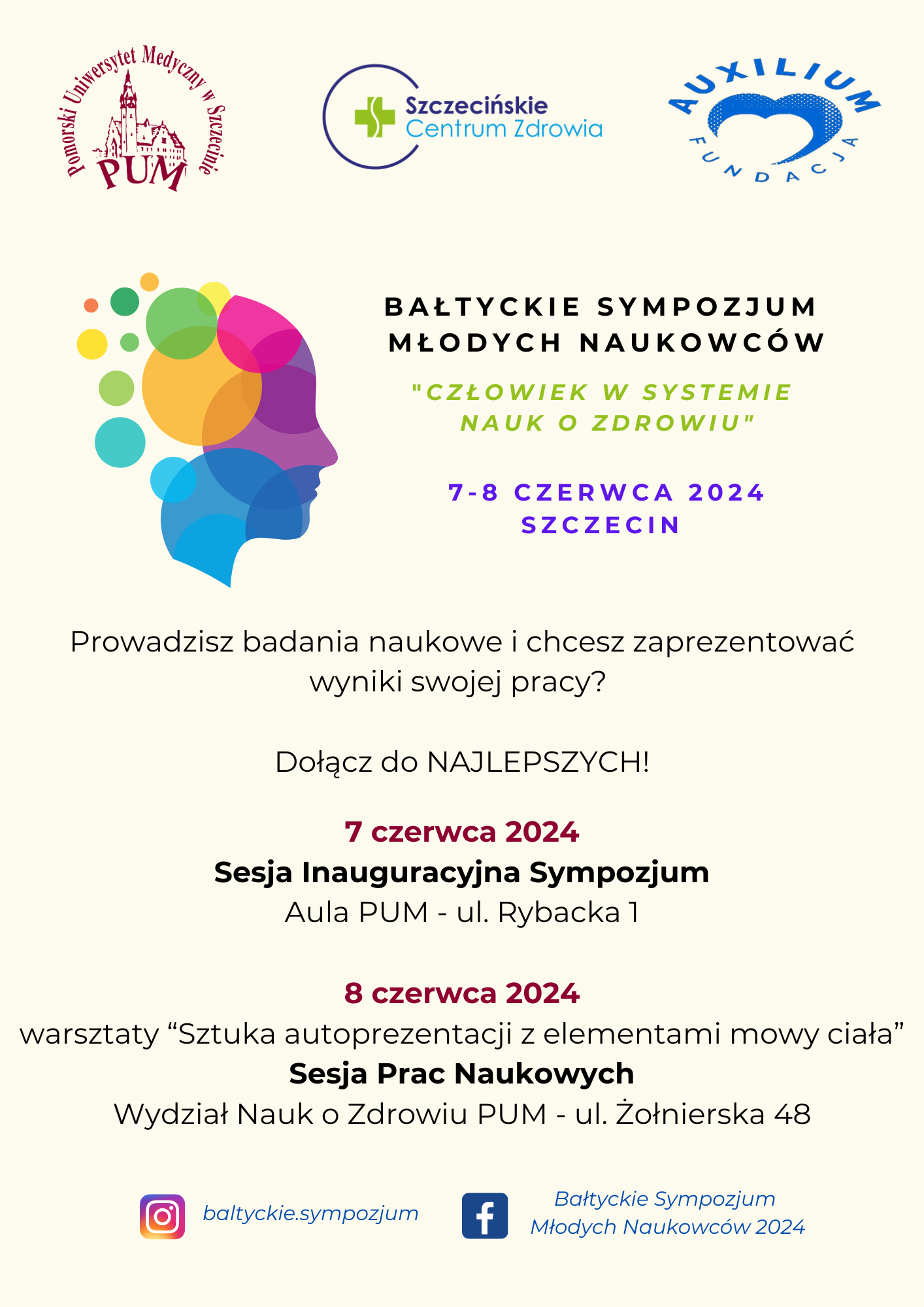 Organizatorami tegorocznego Sympozjum Młodych Naukowców są: Wydział Nauk o Zdrowiu Pomorskiego Uniwersytetu Medycznego w Szczecinie, Szczecińskie Centrum Zdrowia SP ZOZ oraz Fundacja „Auxilium”. Konferencja skierowana jest do studentów, doktorantów i młodych pracowników (do dwóch lat po uzyskaniu stopnia naukowego doktora), którzy prowadzą badania i realizują się w szeroko pojętym obszarze medycznym, naukach o zdrowiu, promocji i ochronie zdrowia.