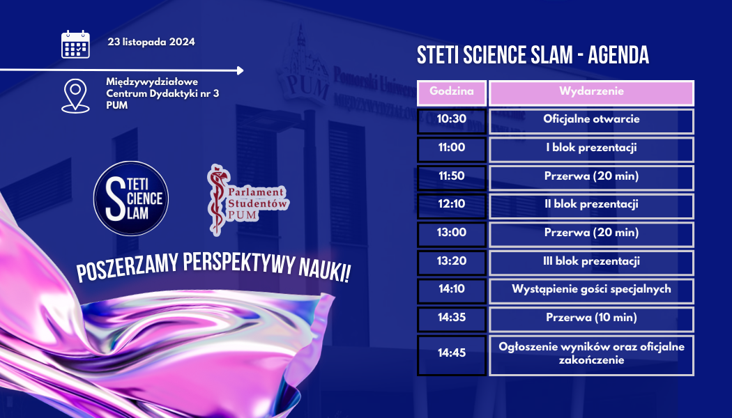 Zapraszamy na konferencję naukowo-edukacyjną Steti Science Slam!, która odbędzie się 23 listopada 2024 r. w Międzywydziałowym Centrum Dydaktyki nr 3 PUM.