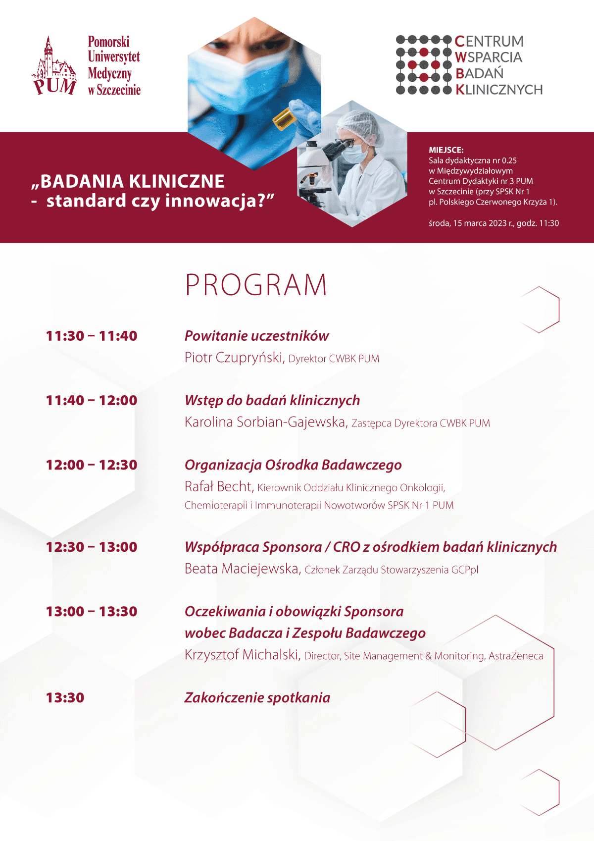 Serdecznie zapraszamy na szkolenie organizowane przez Centrum Wsparcia Badań Klinicznych PUM (CWBK). Uczestnikami szkolenia mogą być wszyscy pracownicy klinicznych szpitali PUM – SPSK nr 1 oraz SPSK nr 2, wchodzący w skład zespołów badawczych, bądź planujący zawodowy udział w badaniach klinicznych. Spotkanie odbędzie się w środę 15 marca 2023 r. w godz. 11.30-13.30 w sali dydaktycznej nr 0.25 w Międzywydziałowym Centrum Dydaktyki nr 3 PUM przy pl. PCK 1 w Szczecinie (obok bramy głównej do SPSK nr 1).