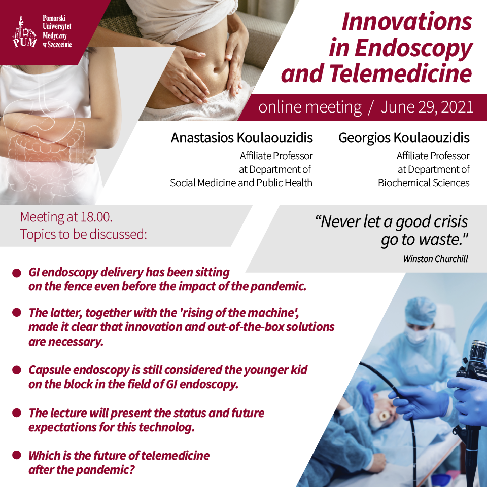 Ta maksyma Winstona Churchilla towarzyszyć będzie spotkaniu online tematycznie poświęconemu „Innowacjom w endoskopii i telemedycynie”. Merytoryczny program przeprowadzą afiliowani profesorowie Anastasios Koulaouzidis z Zakładu Medycyny Społecznej i Zdrowia Publicznego i Georgios Koulaouzidis z Samodzielnej Pracowni Badań Biochemicznych PUM.