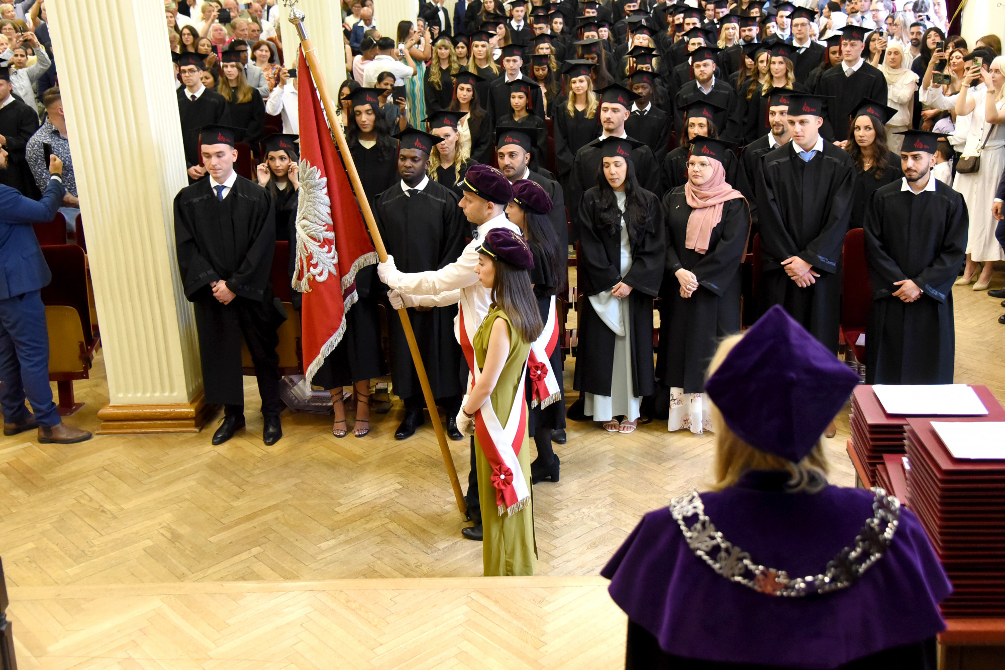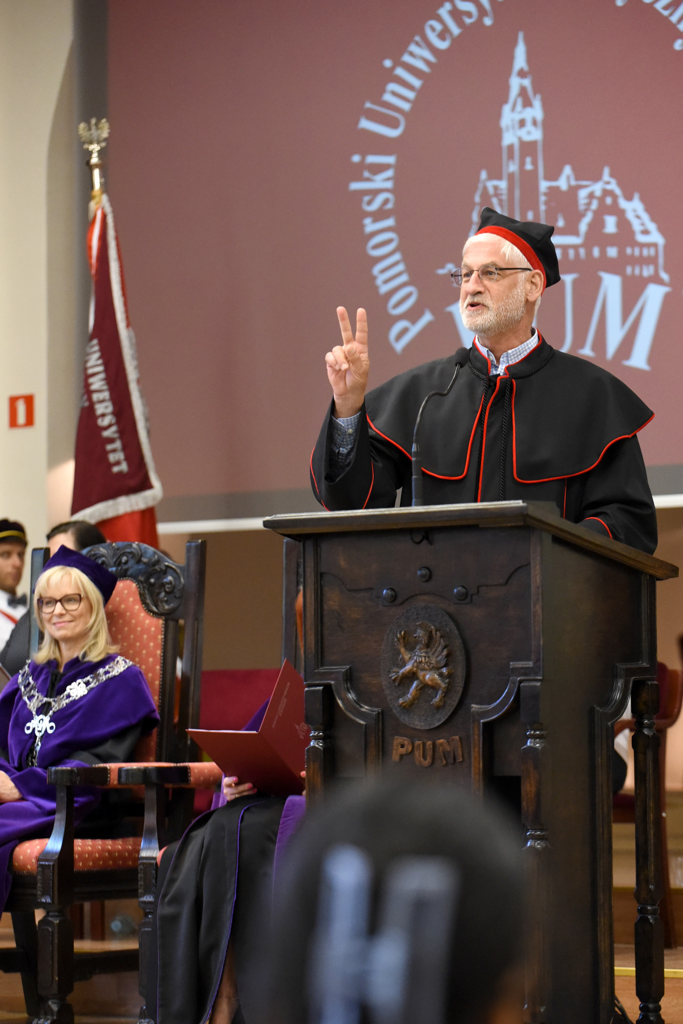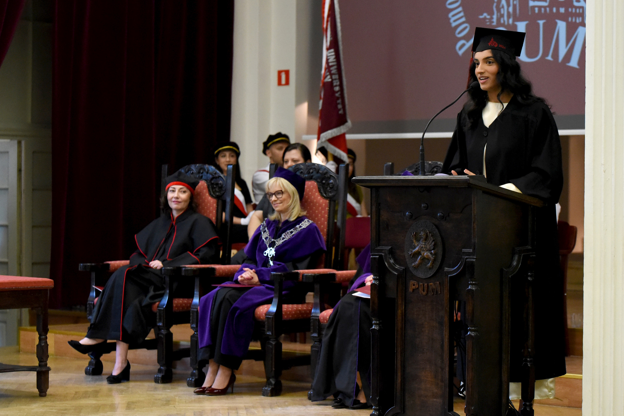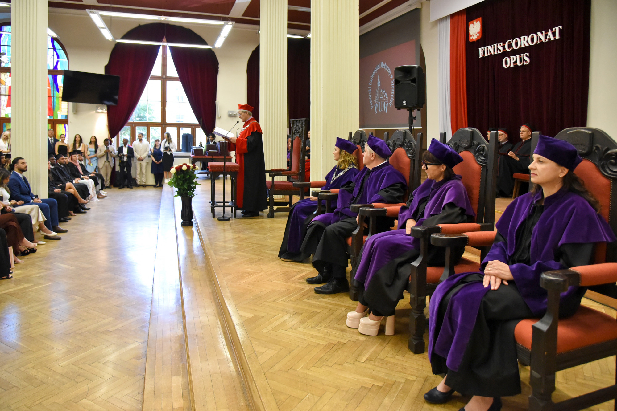 Gospodarzem uroczystości była prodziekan Wydziału Medycyny i Stomatologii prof. PUM dr hab. n. med. Aleksandra Gawlikowska-Sroka, która powitała władze uczelni, przybyłych gości, absolwentów i ich bliskich oraz kadrę dydaktyczną PUM.