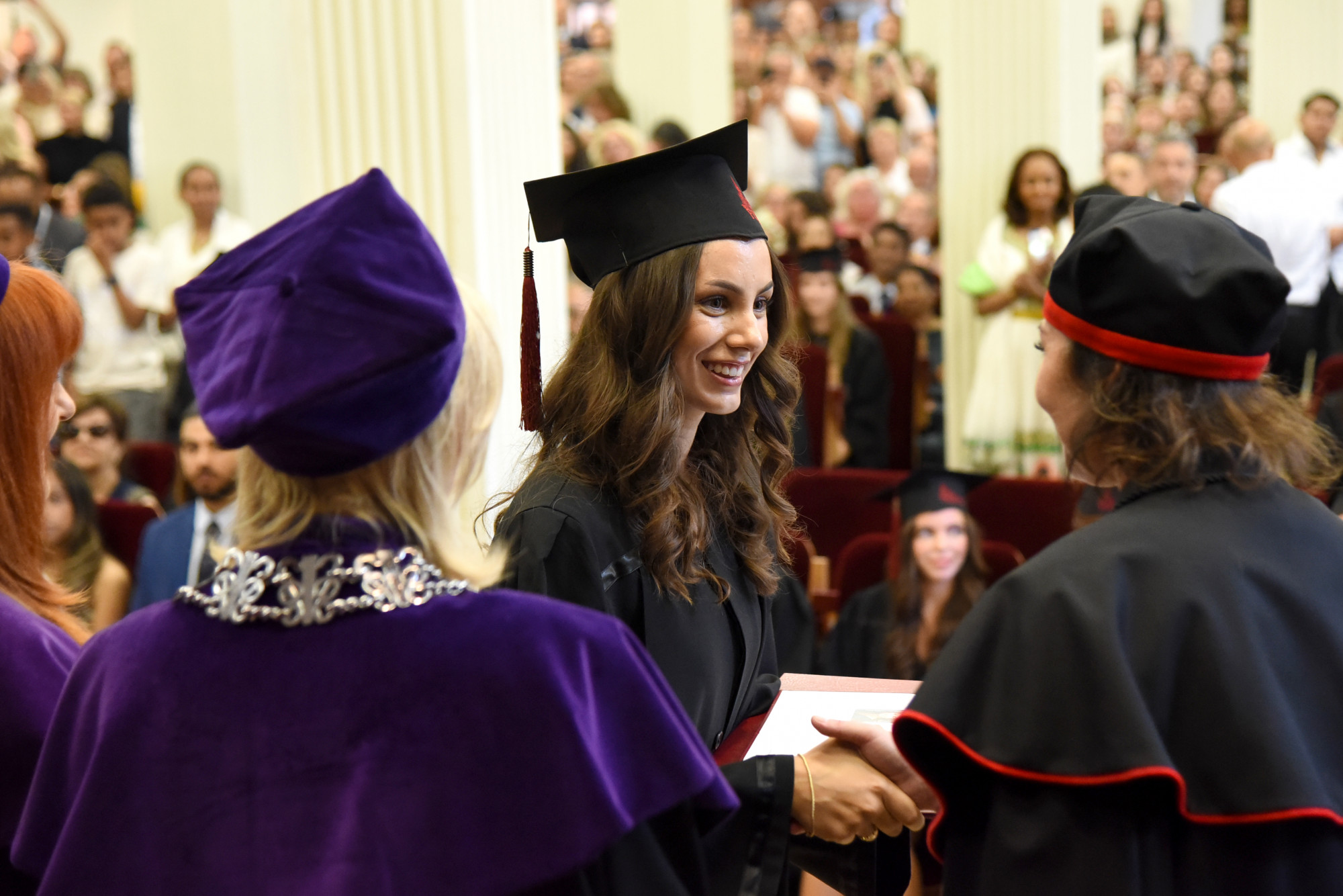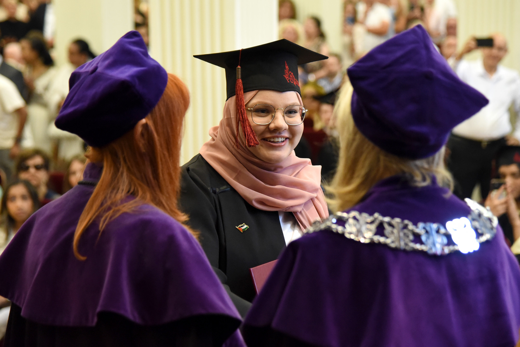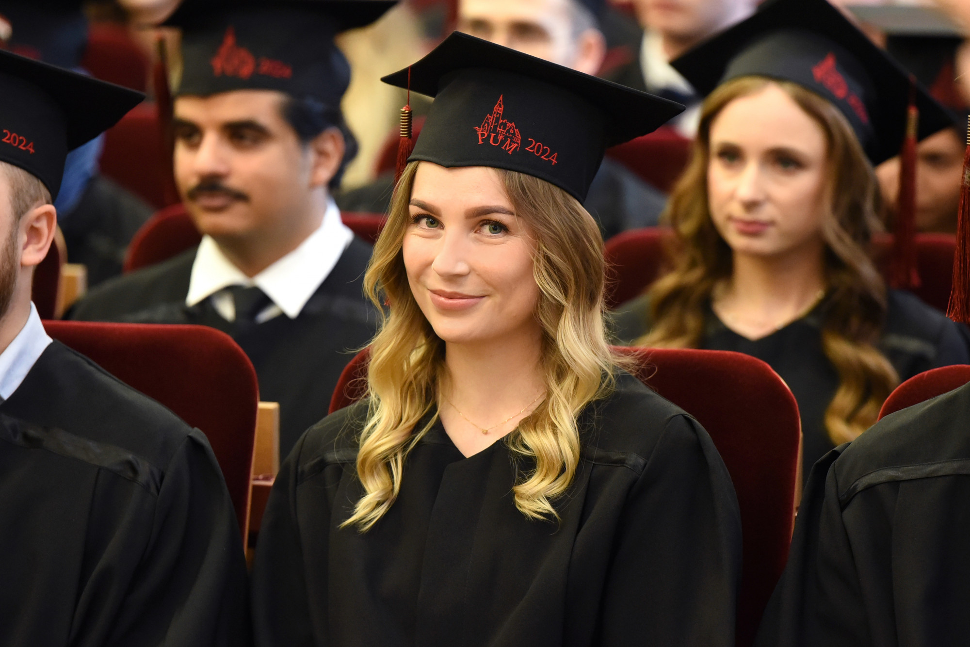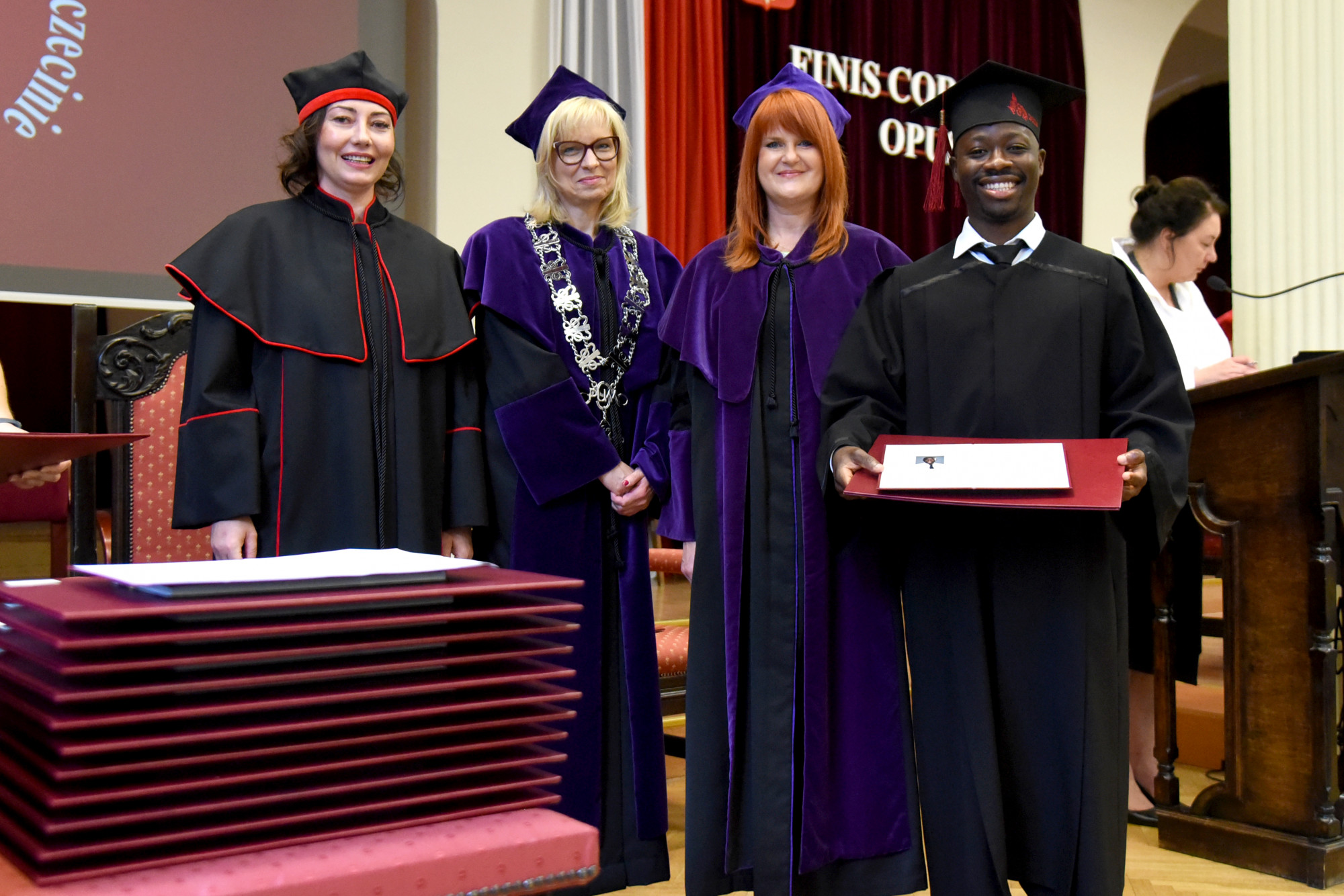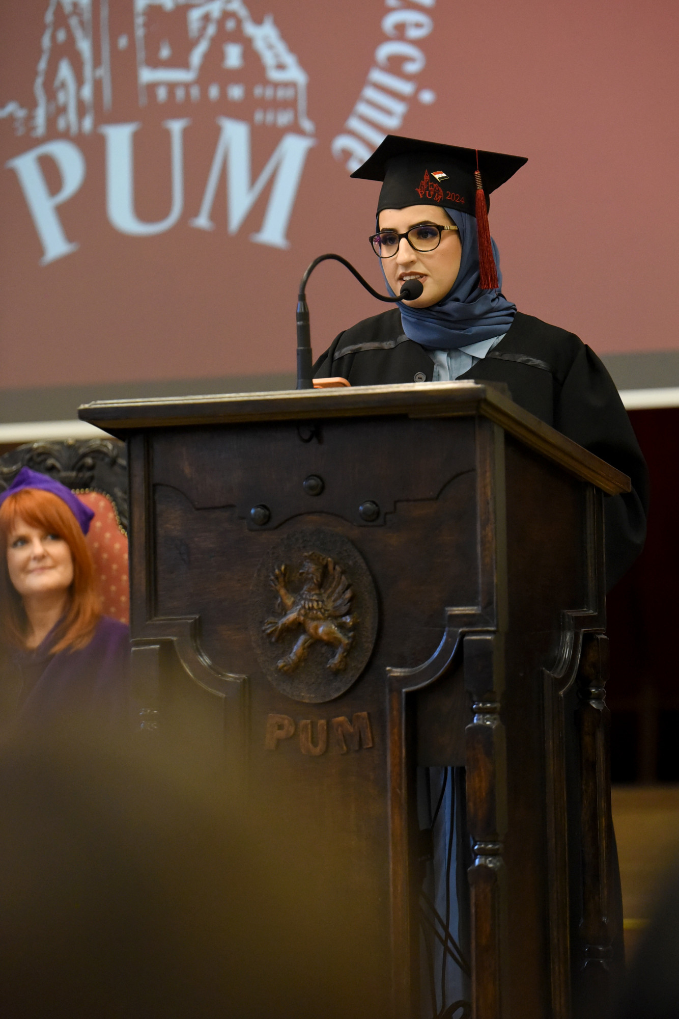 To wyjątkowe dla absolwentów wydarzenie uświetniły także przemowy prof. dr hab. n. med. Edyty Paczkowskiej, dr hab. n med. Aleksandry Wilk i prof. PUM dr hab. n med. Aleksandry Gawlikowskiej- Sroki. Przemawiali również zaproszeni na uroczystość, od lat współpracujący z uczelnią profesorowie wizytujący PUM z Hamm, Poczdamu i Frankfurtu nad Odrą: prof. Wolfgang Kamin, prof. dr Gralf Popken i prof. dr Christiane Richter-Ehrenstein. W imieniu studentów głos zabrały: p. Areesha Shahnawaz oraz p. Maram Samir.