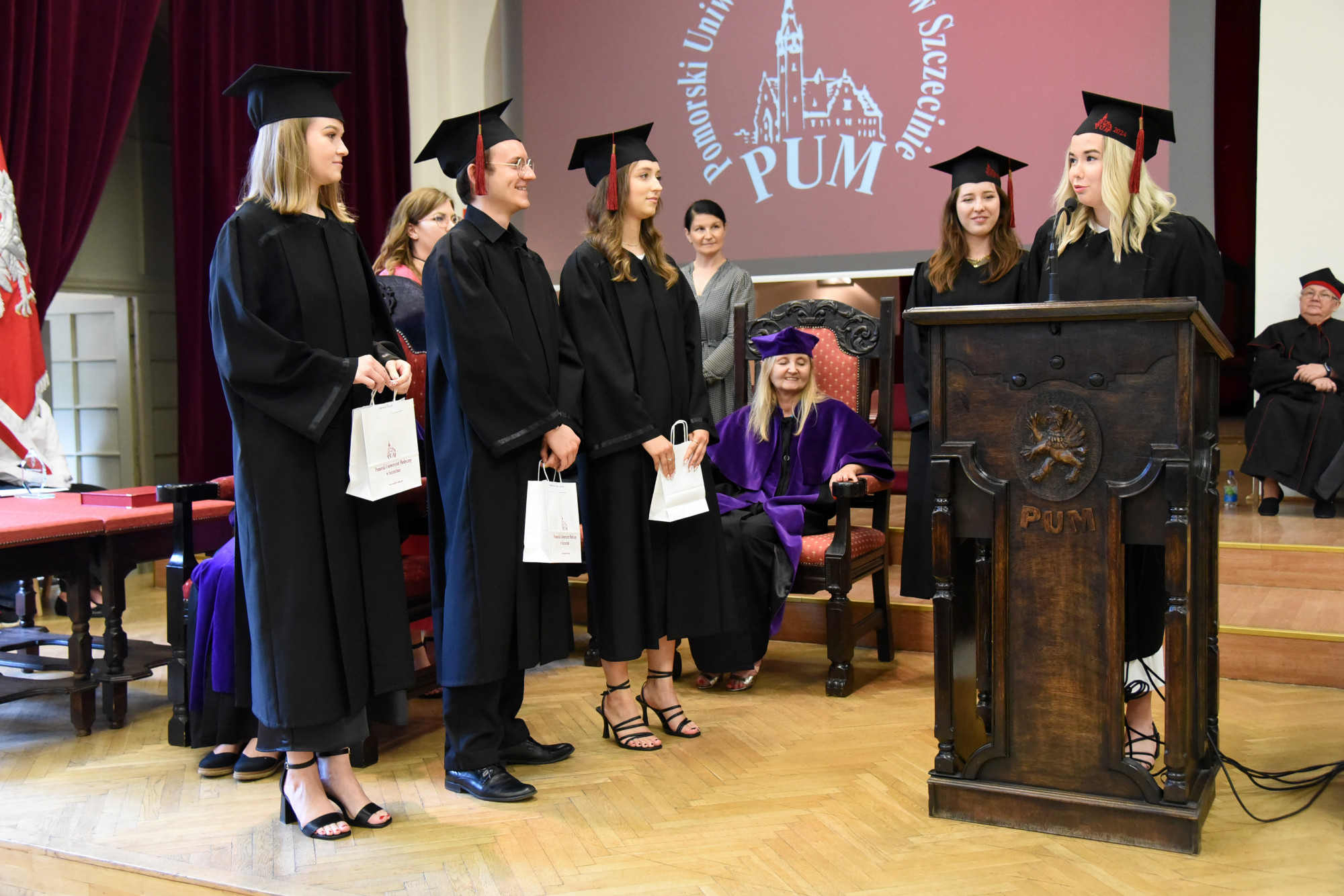 Podczas ceremonii głos zabrali również przedstawiciele społeczności akademickiej - p. Klaudia Cholewa, przedstawicielka Parlamentu Studentów PUM, p. Aleksandra Idzikowska przedstawicielka Studenckiego Towarzystwa Diagnostów Laboratoryjnych, p. Marcin Klag, przedstawiciel Studenckiego Towarzystwa Naukowego oraz przedstawiciele Absolwentów: p. Adrianna Jerzyk, p. Dominika Miłek oraz p. Bogusław Kowalski. Zostały również przyznane nagrody studentom, którzy uzyskali wysoką średnią ze studiów, a także studentom analityki medycznej, którzy zajęli trzy pierwsze miejsca w Wydziałowym Konkursie na najlepszą pracę magisterską (Ewa Major – I miejsce, praca została zgłoszona na Ogólnopolski Konkurs Prac Magisterskich Absolwentów kierunku analityka medyczna: Daria Kołodziej – II miejsce oraz Aleksandra Pieniecka - III miejsce), którym nagrody wręczył przedstawiciel Krajowej Izby Diagnostów Laboratoryjnych, dr n. med. Konrad Grzeszczak. Dumni rodzice i nauczyciele nagradzali absolwentów gromkimi owacjami.