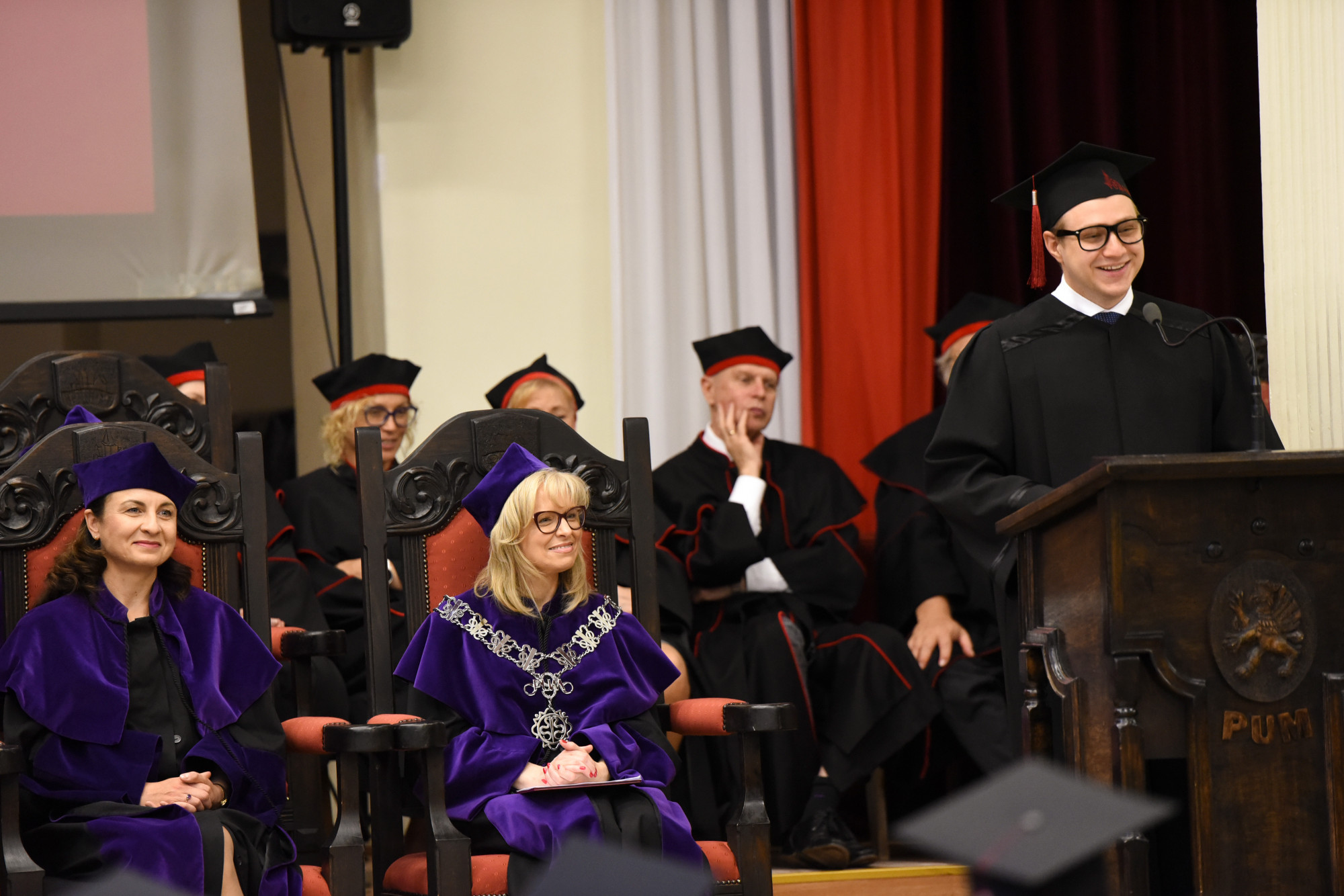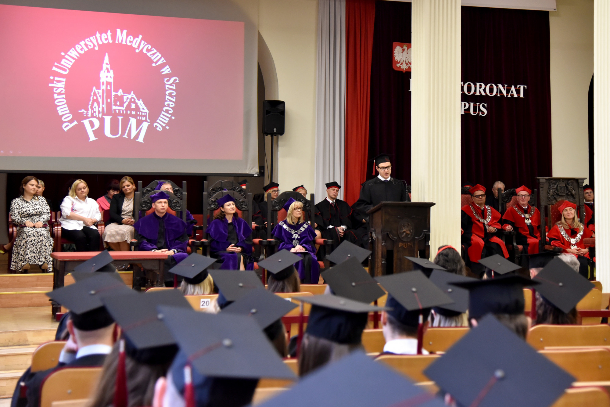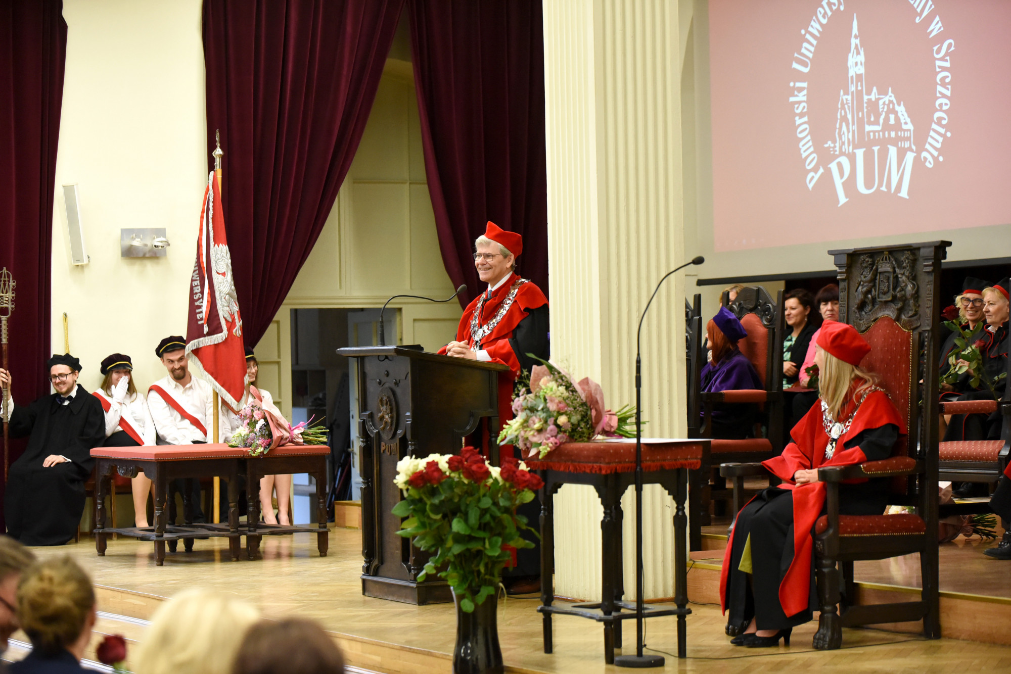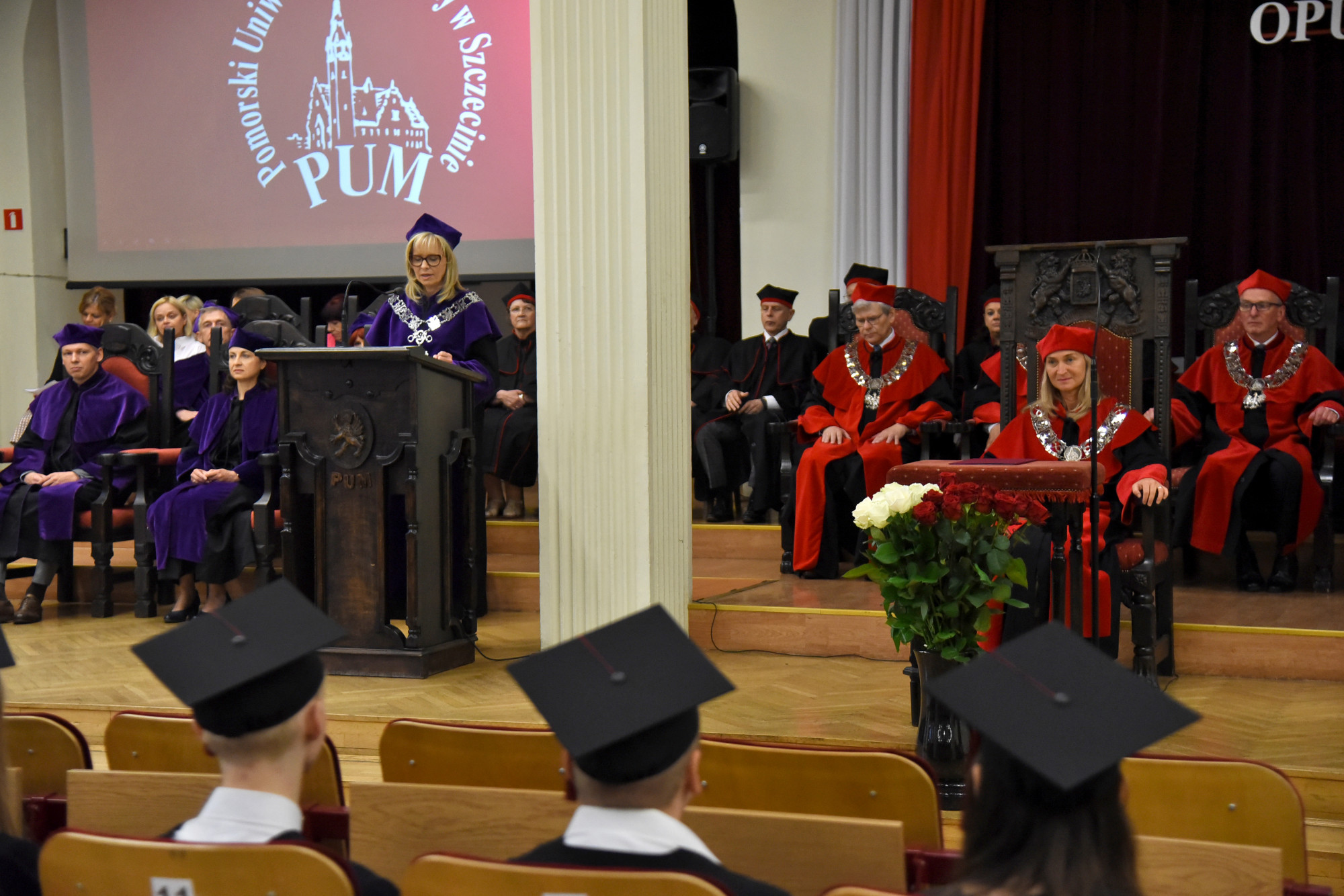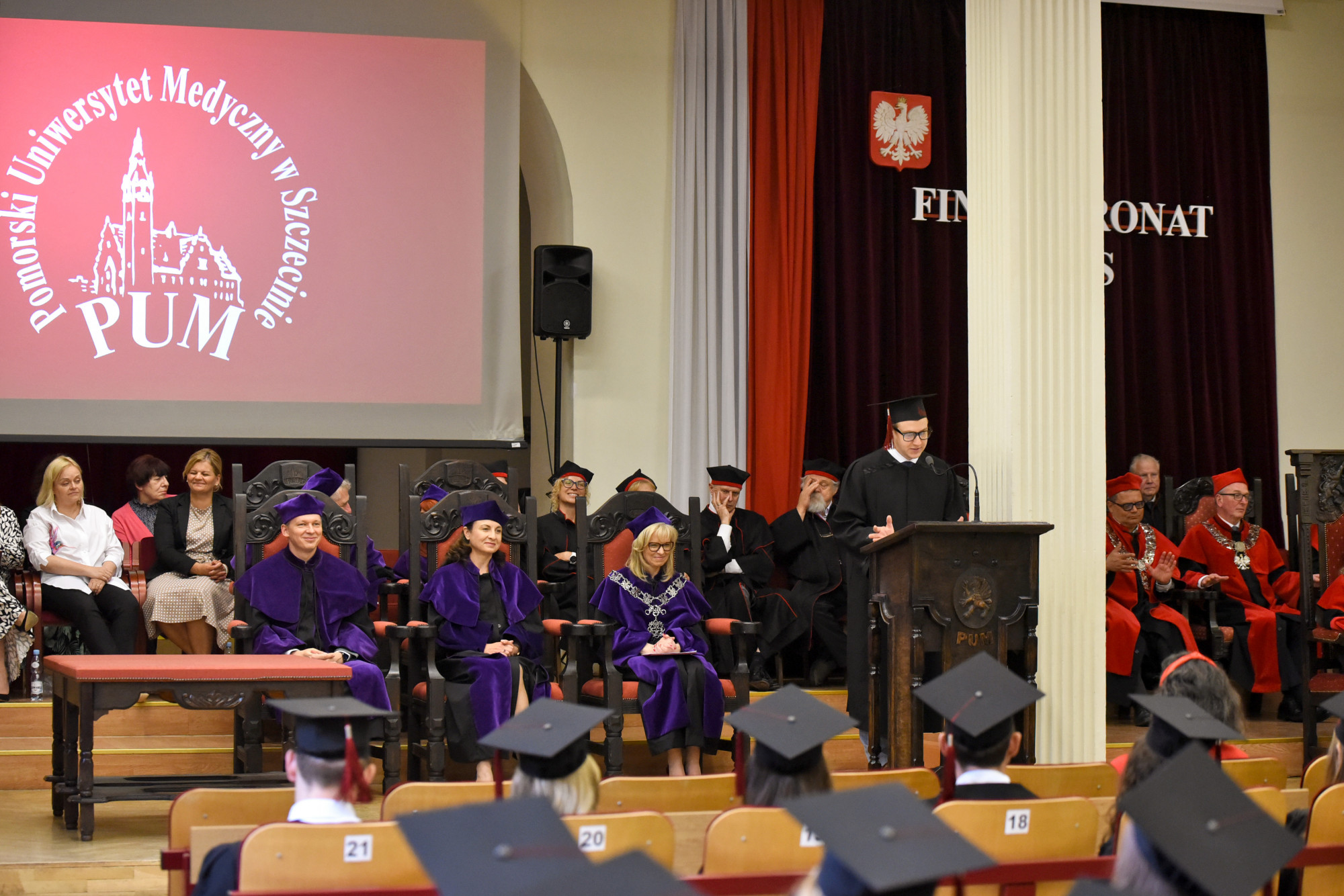 Funkcję mistrza ceremonii pełniła dziekan Wydziału Medycyny i Stomatologii PUM dr hab. Edyta Paczkowska, która przywitała gospodarzy, przybyłych gości, absolwentów i ich bliskich oraz kadrę dydaktyczną PUM. Magnificencję Rektora Pomorskiego Uniwersytetu Medycznego prof. Bogusława Machalińskiego reprezentowała prof. Aneta Cymbaluk-Płoska, prorektor ds. dydaktyki.