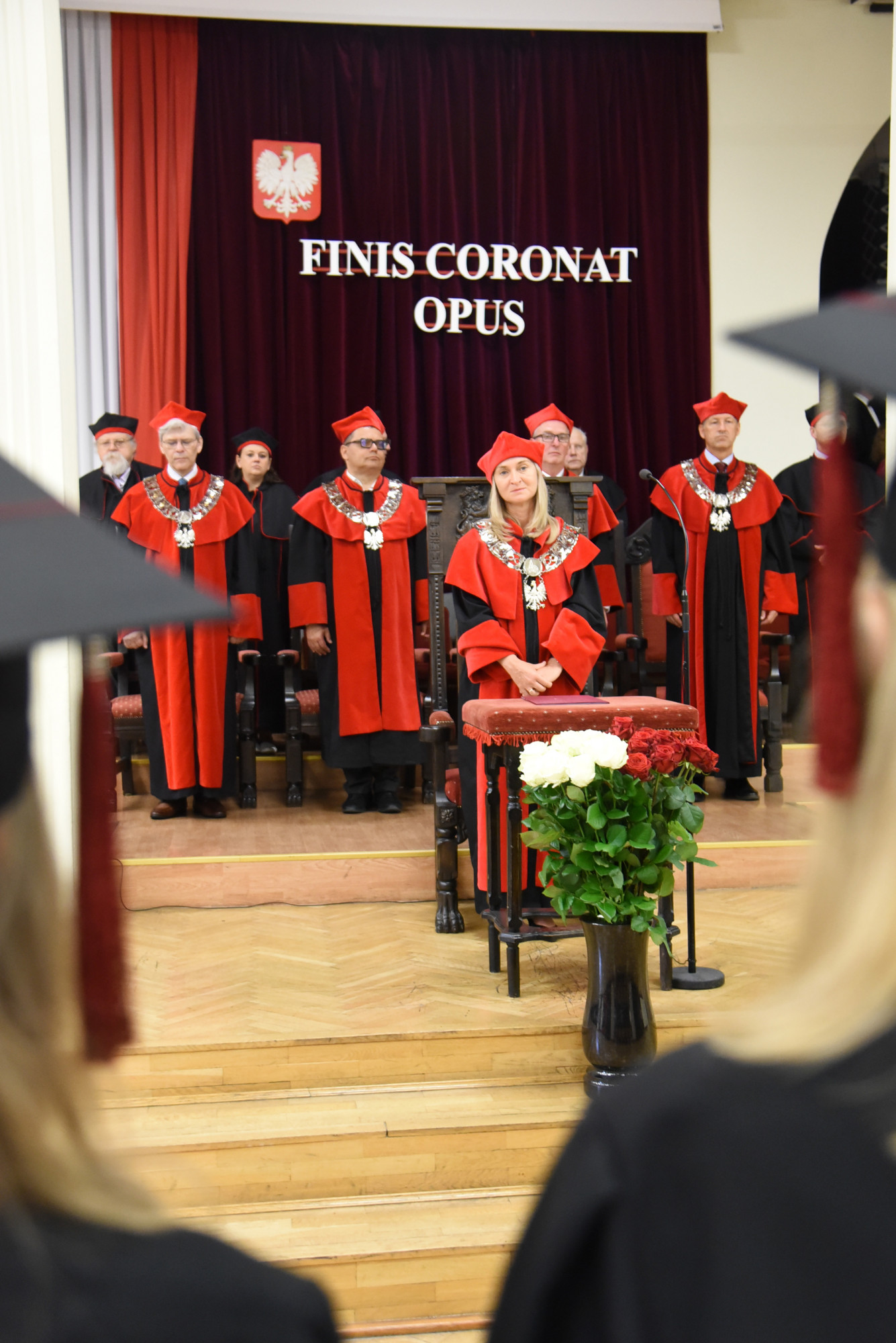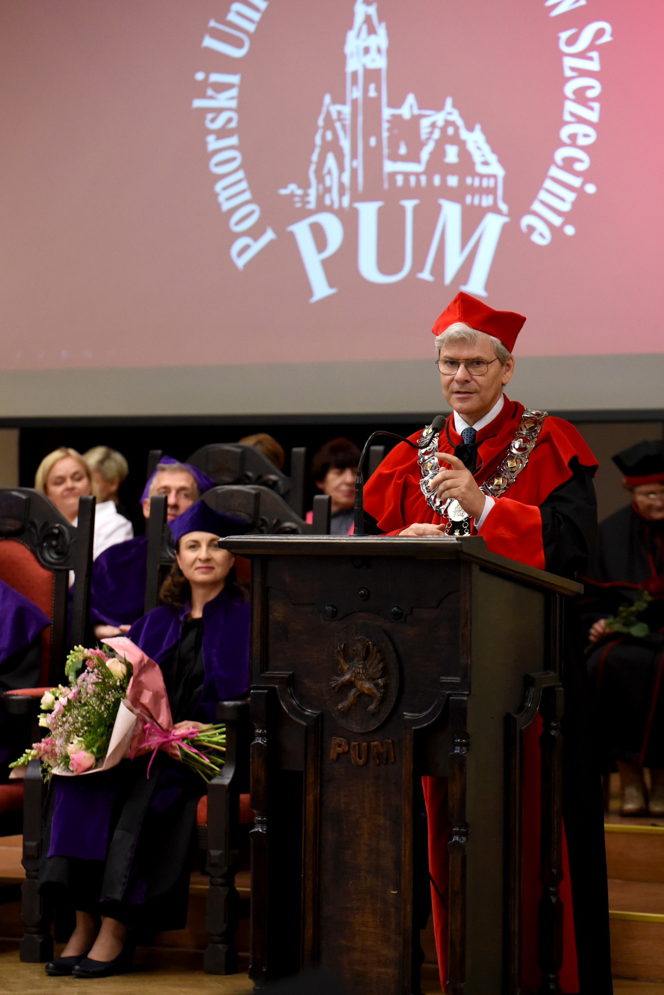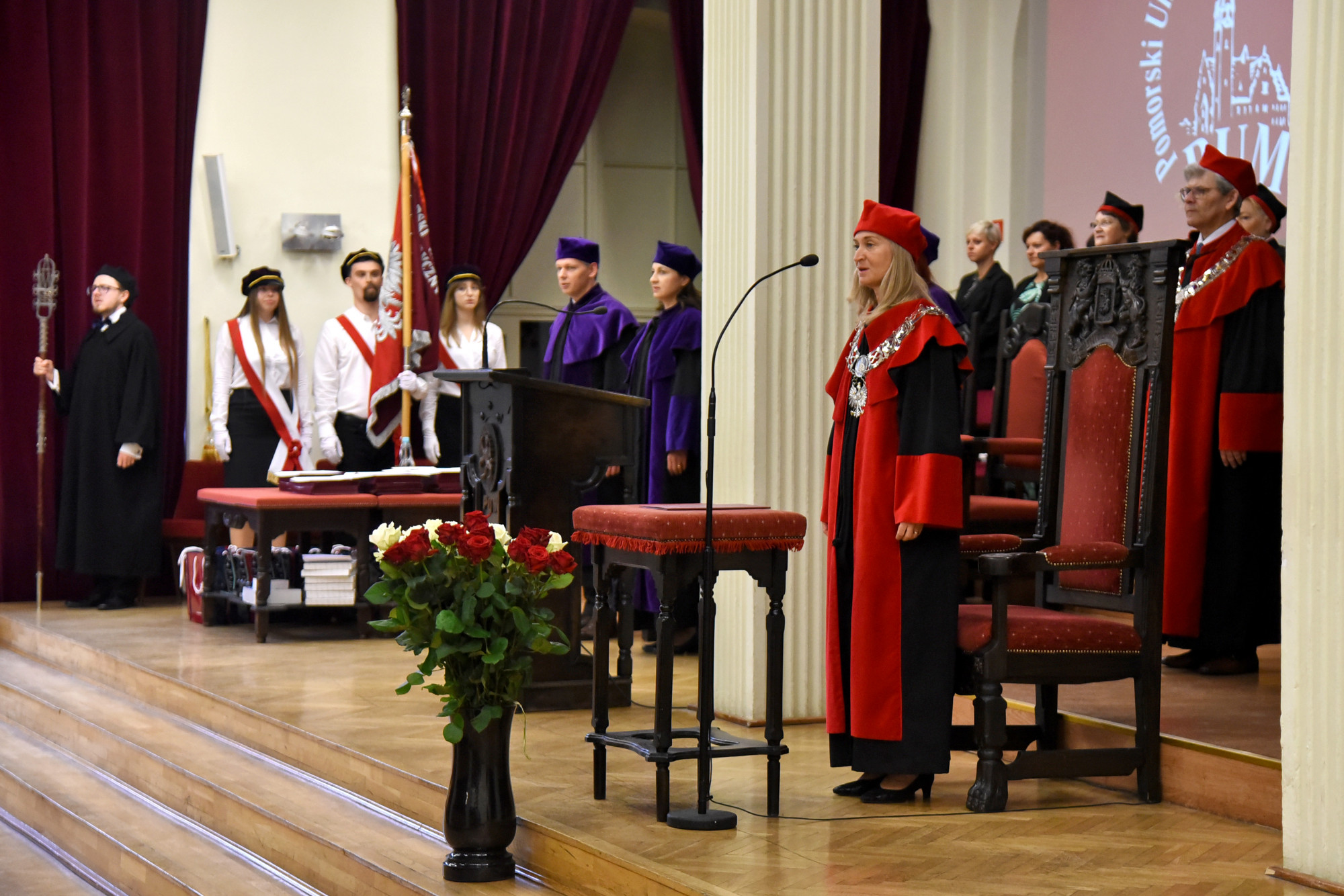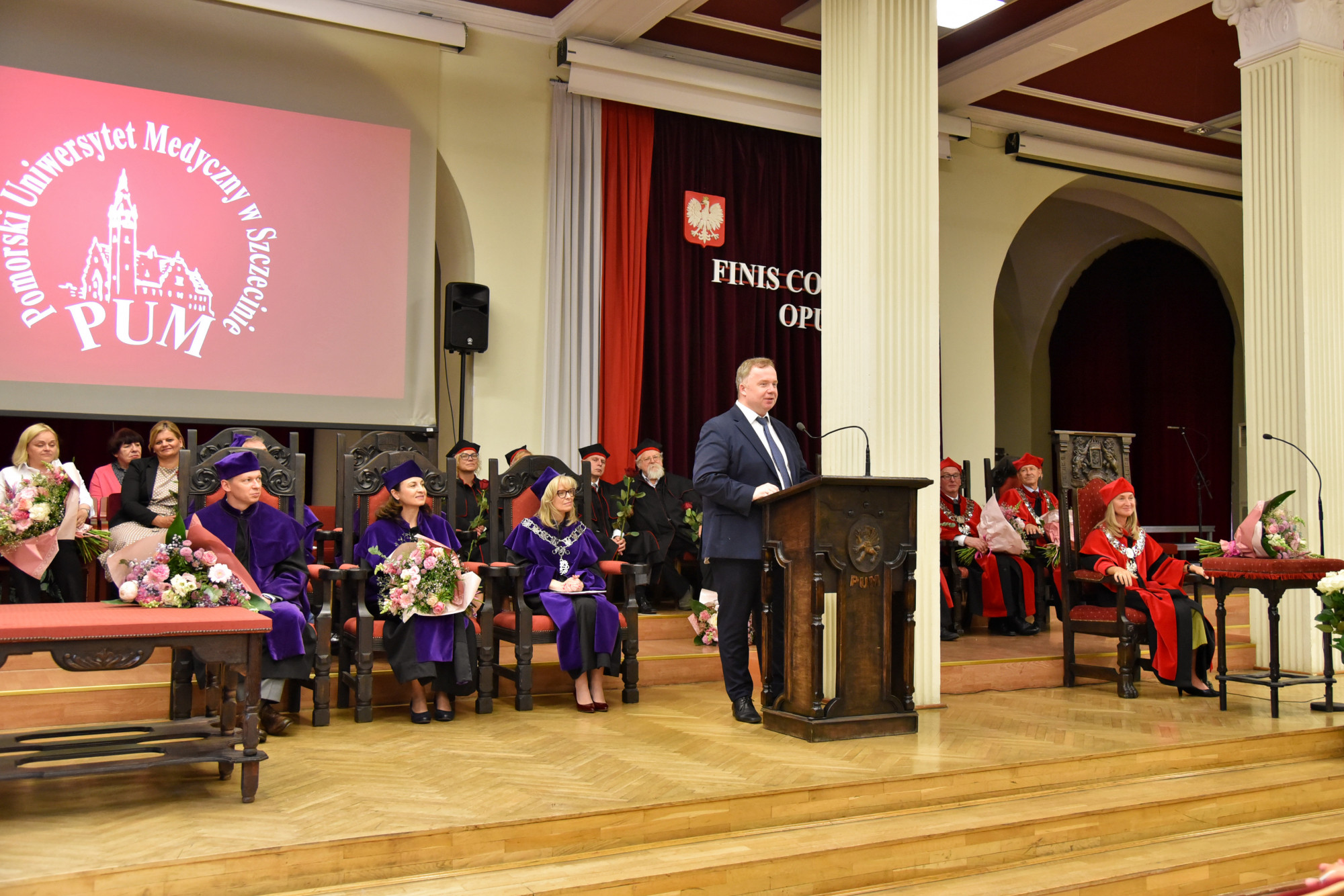 Funkcję mistrza ceremonii pełniła dziekan Wydziału Medycyny i Stomatologii PUM dr hab. Edyta Paczkowska, która przywitała gospodarzy, przybyłych gości, absolwentów i ich bliskich oraz kadrę dydaktyczną PUM. Magnificencję Rektora Pomorskiego Uniwersytetu Medycznego prof. Bogusława Machalińskiego reprezentowała prof. Aneta Cymbaluk-Płoska, prorektor ds. dydaktyki.