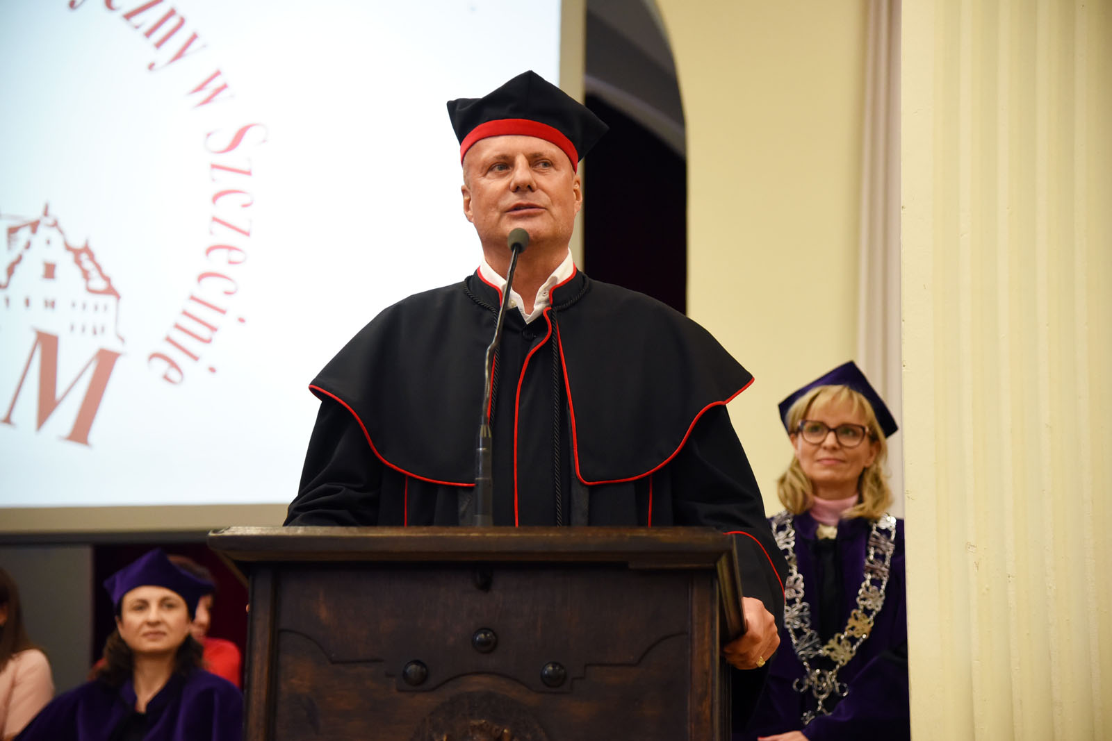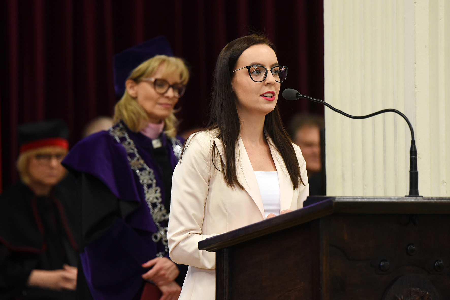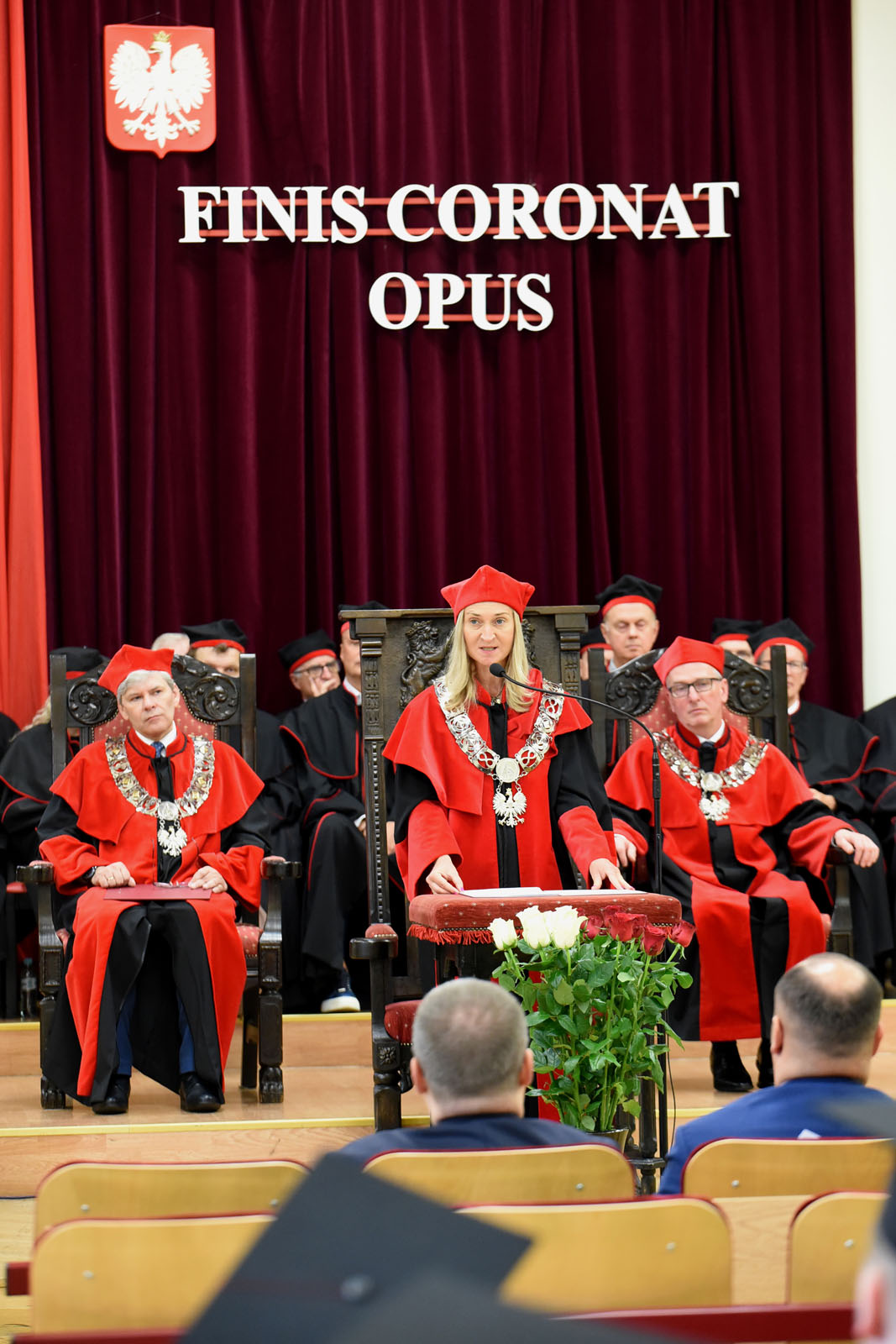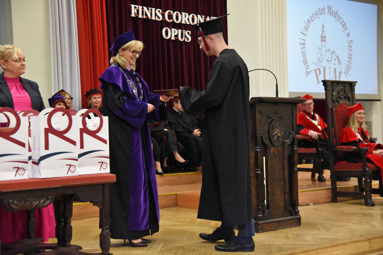 Mistrz ceremonii, Dziekan Wydziału Medycyny i Stomatologii PUM dr hab. n. med. Edyta Paczkowska, przywitała gospodarzy, przybyłych gości, Absolwentów i ich bliskich oraz kadrę dydaktyczną PUM. Magnificencję Rektora Pomorskiego Uniwersytetu Medycznego prof. Bogusława Machalińskiego reprezentowała prof. Aneta Cymbaluk-Płoska, Prorektor ds. Dydaktyki, która zabrała głos w jego imieniu.