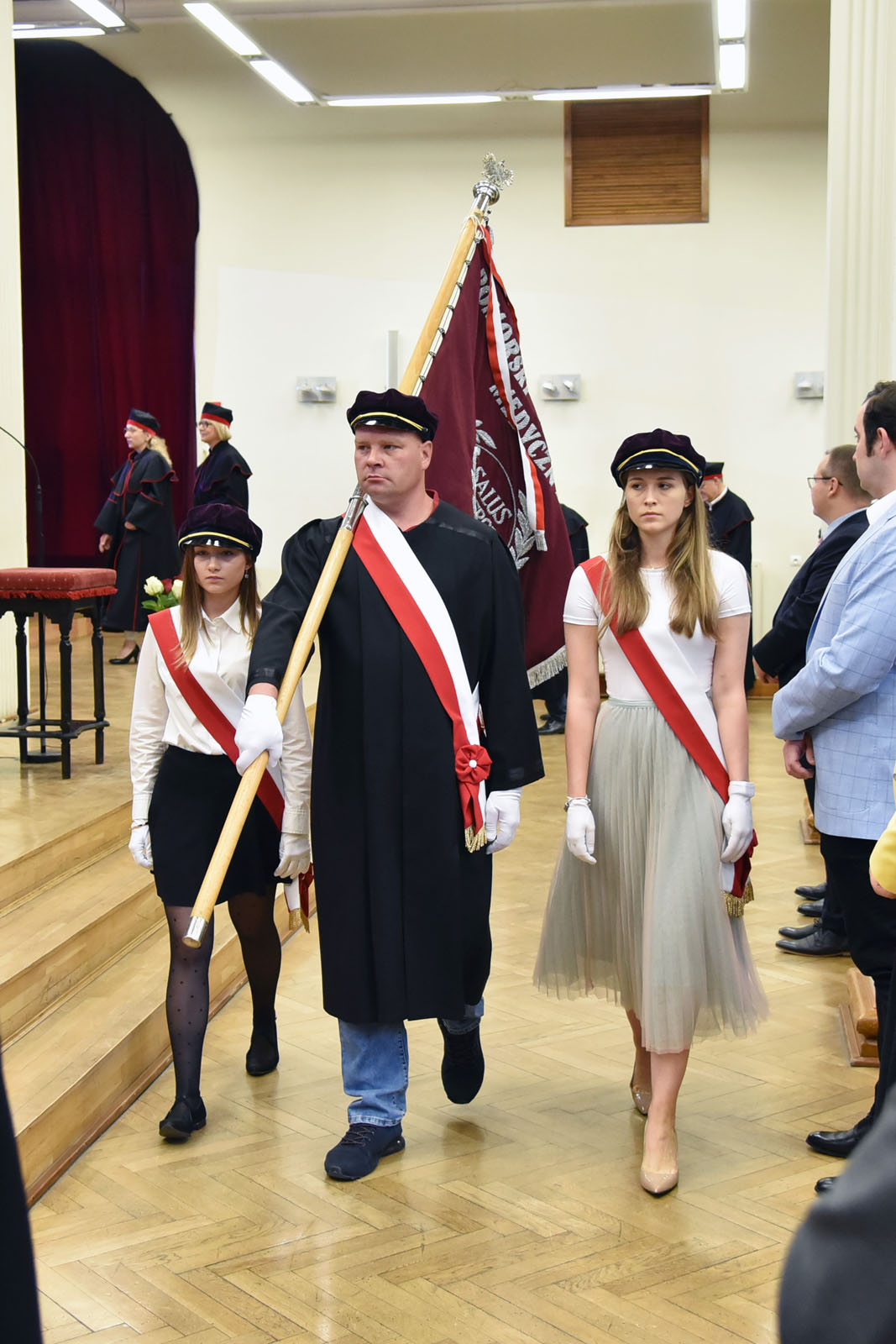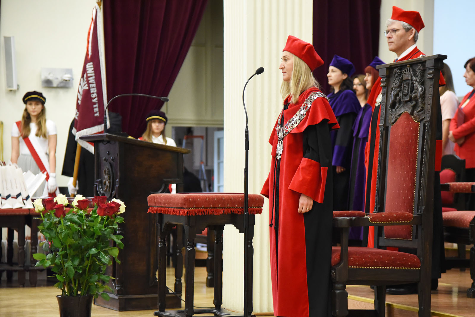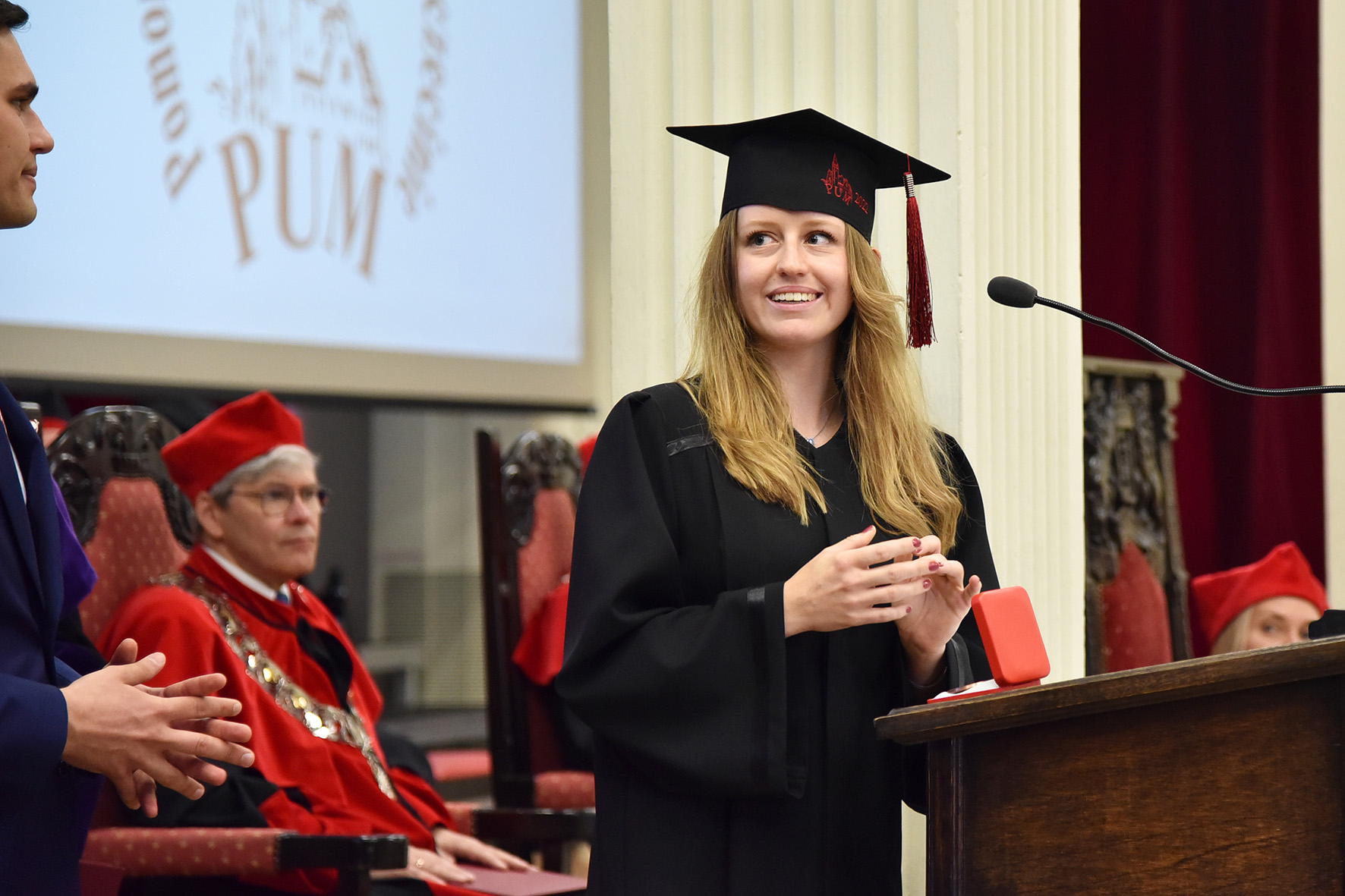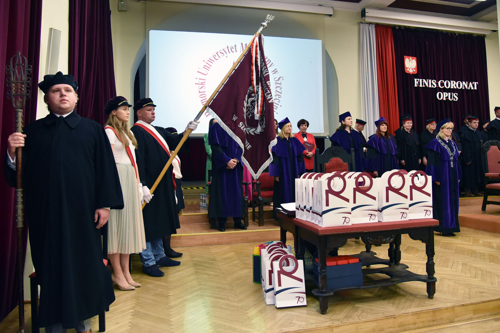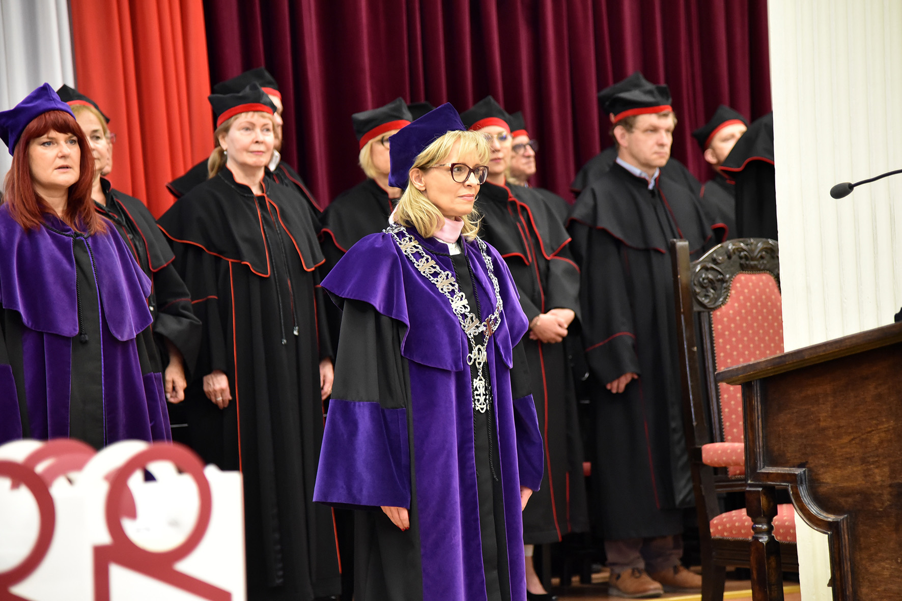 Mistrz ceremonii, Dziekan Wydziału Medycyny i Stomatologii PUM dr hab. n. med. Edyta Paczkowska, przywitała gospodarzy, przybyłych gości, Absolwentów i ich bliskich oraz kadrę dydaktyczną PUM. Magnificencję Rektora Pomorskiego Uniwersytetu Medycznego prof. Bogusława Machalińskiego reprezentowała prof. Aneta Cymbaluk-Płoska, Prorektor ds. Dydaktyki, która zabrała głos w jego imieniu.