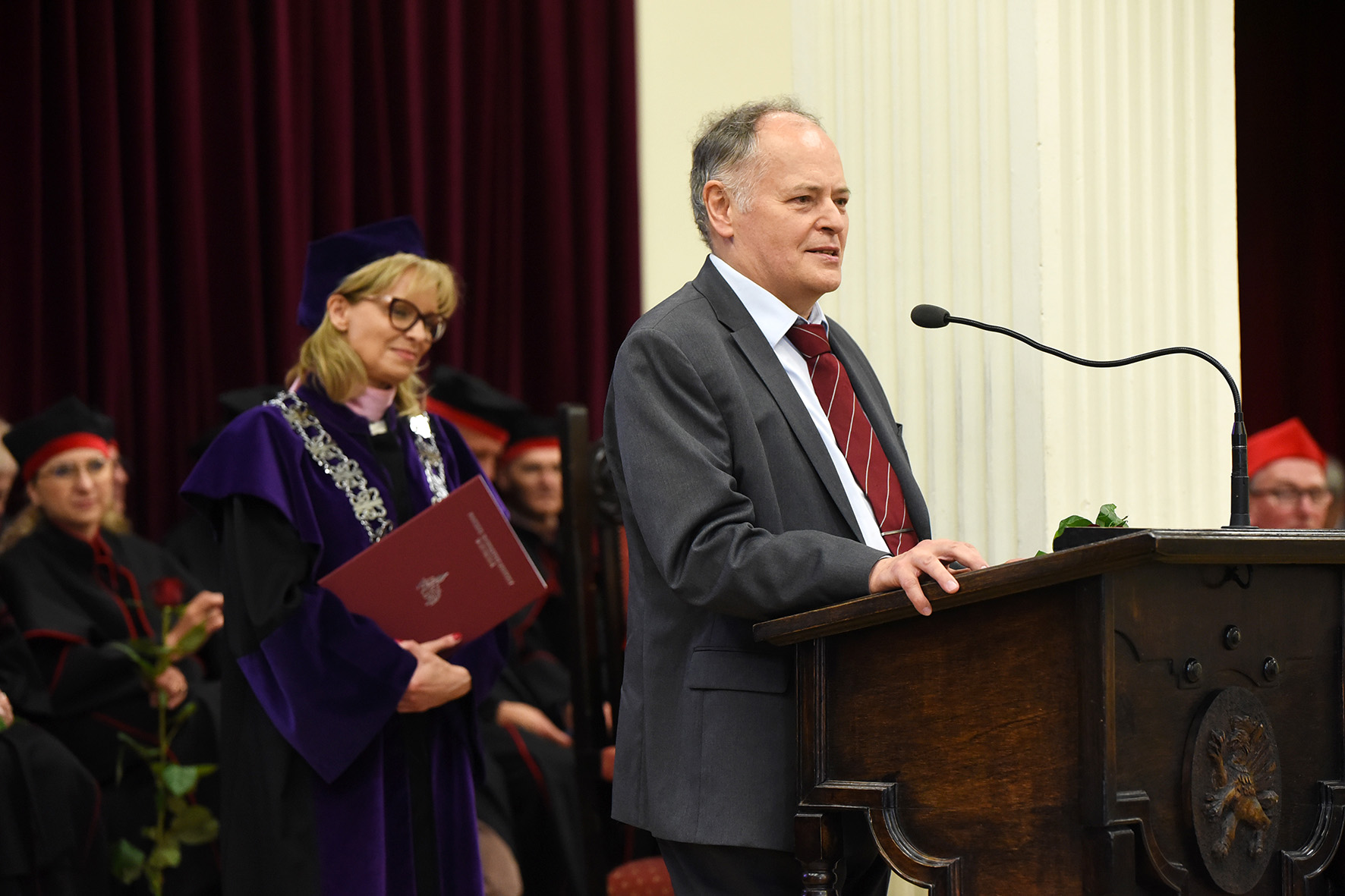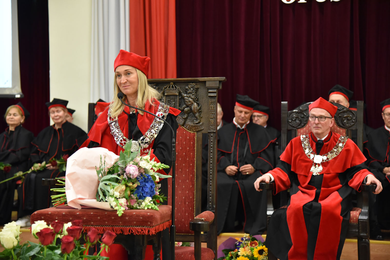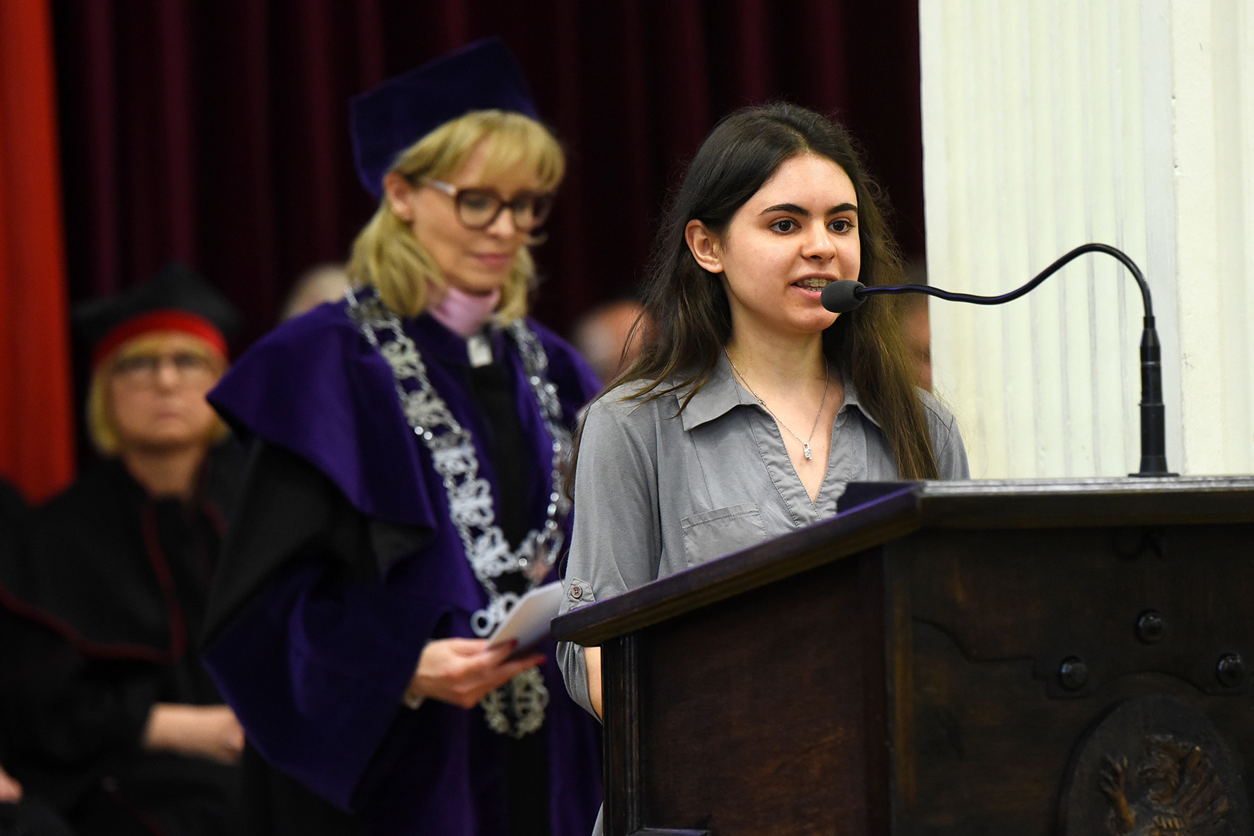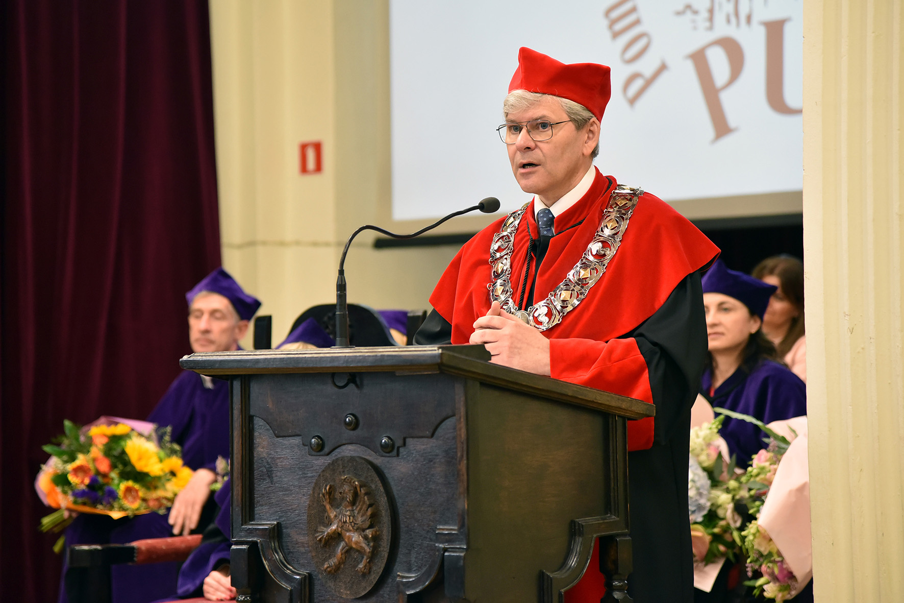 Mistrz ceremonii, Dziekan Wydziału Medycyny i Stomatologii PUM dr hab. n. med. Edyta Paczkowska, przywitała gospodarzy, przybyłych gości, Absolwentów i ich bliskich oraz kadrę dydaktyczną PUM. Magnificencję Rektora Pomorskiego Uniwersytetu Medycznego prof. Bogusława Machalińskiego reprezentowała prof. Aneta Cymbaluk-Płoska, Prorektor ds. Dydaktyki, która zabrała głos w jego imieniu.