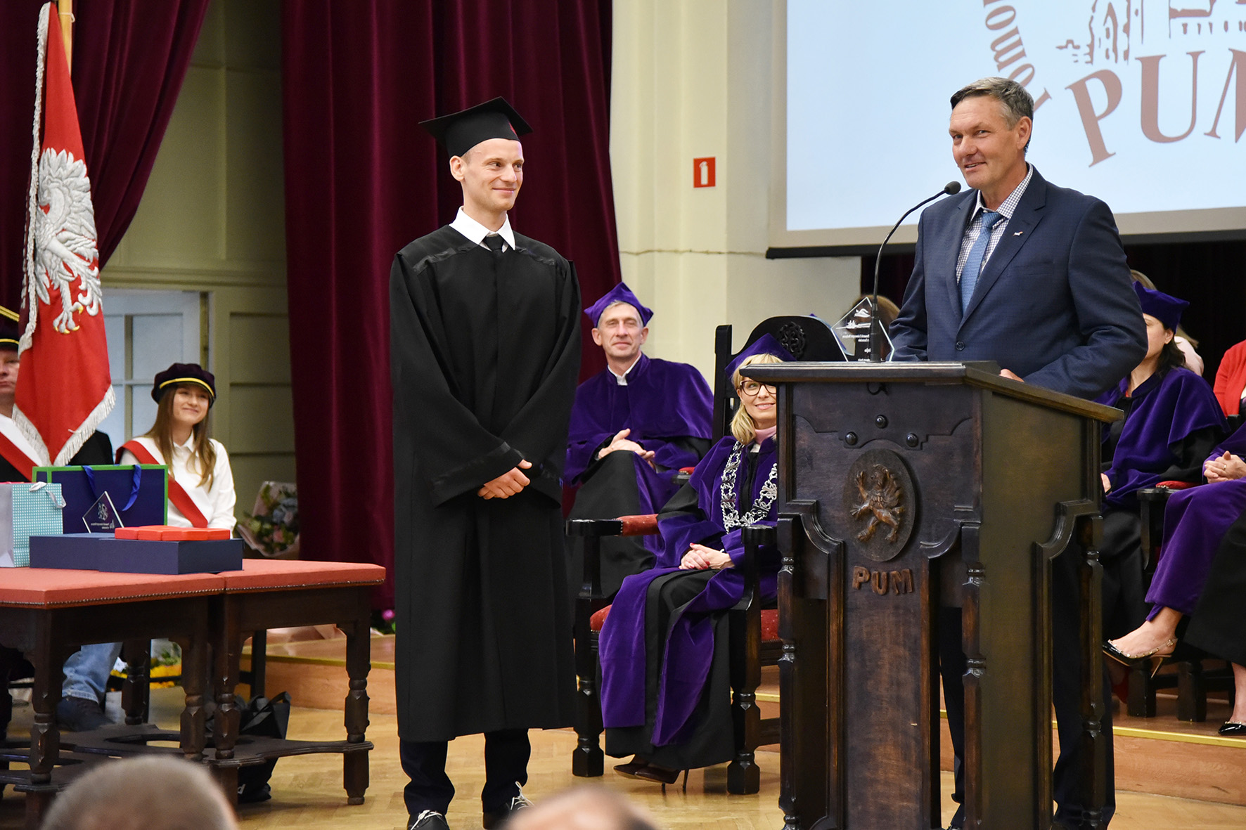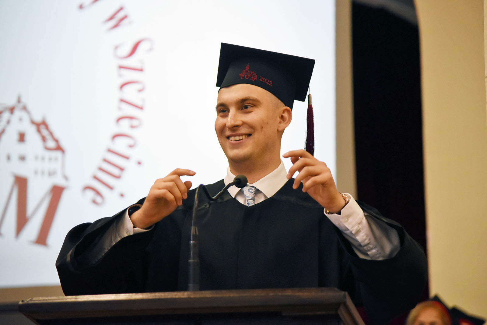 W tym wyjątkowym dla Absolwentów dniu wystąpili m.in. pan Michał Gruszewski jako przedstawiciel Absolwentów, pani Natalia Piwko w imieniu Parlamentu Studentów PUM, pani Gabriela Furtak z ramienia IFMSA oraz prezes Okręgowej Rady Lekarskiej w Szczecinie dr n. med. Michał Bulsa. Prof. Dariusz Chlubek zabrał głos w imieniu rodziców Absolwentów. Na zakończenie wybrzmiały serdeczne słowa skierowane do Absolwentów przez prof. Anetę Cymbaluk-Płoskę, Prorektor ds. Dydaktyki PUM. W przemówieniach nie zabrakło ważnych i wzruszających akcentów. Całą uroczystość uświetnił występ chóru PUM pod dyrekcją prof. Ryszarda Handke.