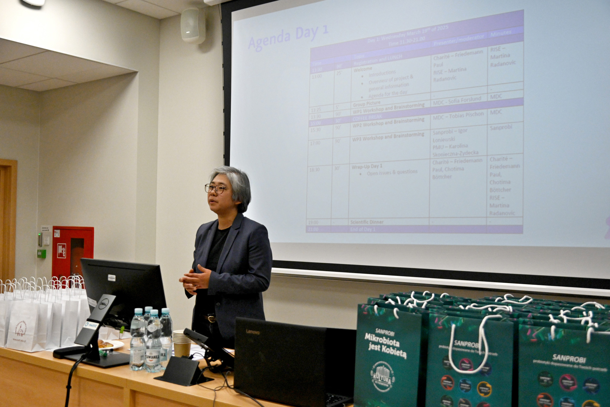 Podczas spotkania uczestnicy omówili dotychczasowe postępy, koncentrując się w szczególności na zakończonym już badaniu klinicznym z zastosowaniem Akkermansia muciniphila u pracowników ochrony zdrowia. Było to niezwykle wymagające przedsięwzięcie, obejmujące rekrutację 200 uczestników spełniających surowe kryteria włączenia oraz ich monitorowanie podczas trzymiesięcznej suplementacji. Badanie, prowadzone pod kierownictwem prof. Karoliny Skoniecznej-Żydeckiej oraz zespołów z Zakładu Badań Biochemicznych, Zakładu Żywienia Człowieka i Metabolomiki, Zakładu Pielęgniarstwa oraz Kliniki Gastroenterologii, zakończyło się na dziewięć miesięcy przed planowanym terminem, co zostało uznane za ogromny sukces.