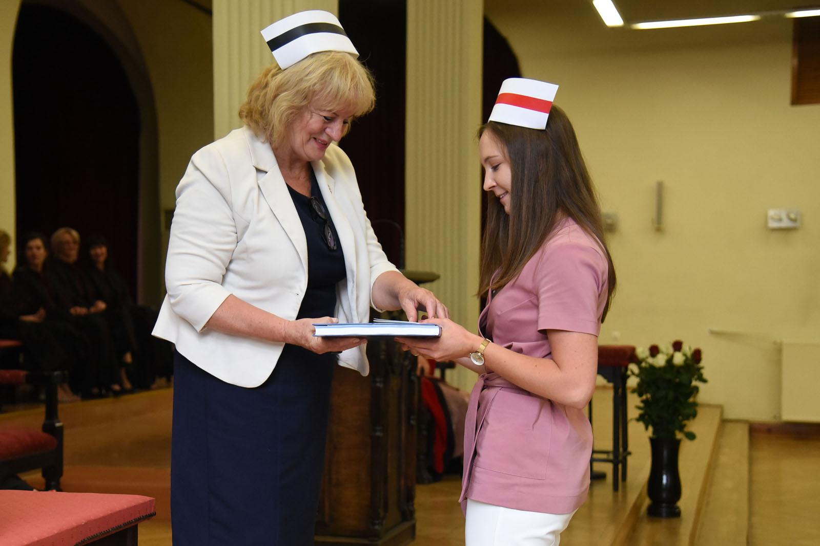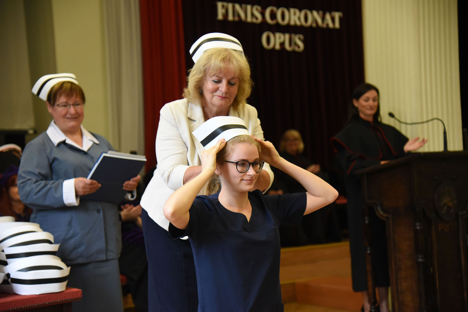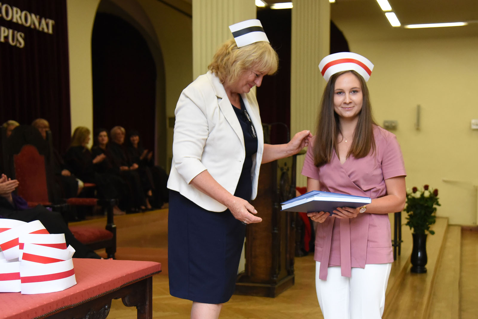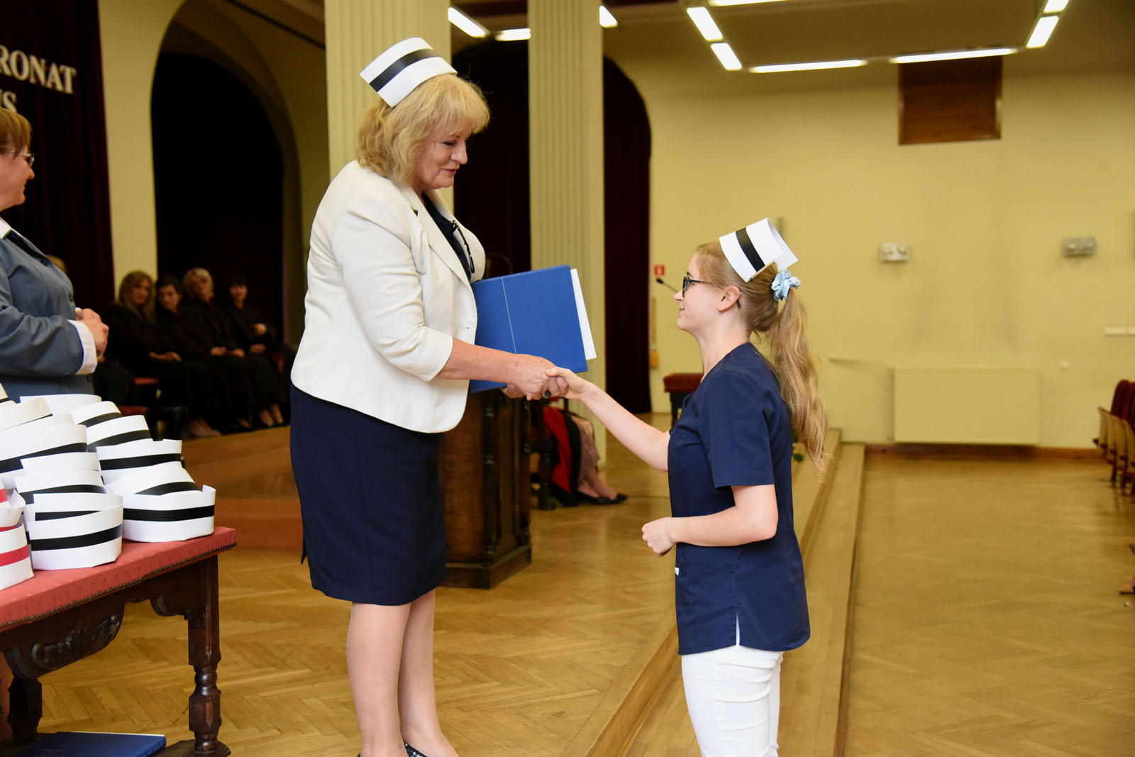 Uroczystość, honorująca zakończenie edukacji zawodowej studentów kierunku Pielęgniarstwo i Położnictwo na poziomie studiów stacjonarnych I stopnia, miała szczególne znaczenie dla absolwentów PUM w Szczecinie, którzy dostąpili zaszczytu przyjęcia czepka – symbolu zawodowego pielęgniarki/pielęgniarza. Licencjatka kierunku Pielęgniarstwo, Pani Katarzyna Białkowska, która uzyskała najwyższą średnią ocen ze studiów 4,76 oraz licencjatka kierunku Położnictwo, Pani Katarzyna Grzyb, która uzyskała najwyższą średnią ocen ze studiów 4,5 przyjęły z rąk mgr Marii Matusiak czepek i nagrodę ufundowaną przez Szczecińską Izbę Pielęgniarek i Położnych.