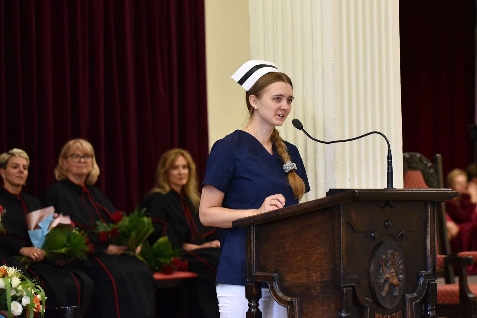 Podczas ceremonii przemawiała prorektor Aneta Cymbaluk-Płoska, prodziekan Karolina Skonieczna-Żydecka, mgr Maria Matusiak, wiceprzewodnicząca Szczecińskiej Izby Pielęgniarek i Położnych, a także przedstawicielki społeczności akademickiej - dr n. med. Marzanna Stanisławska, pełnomocnik ds. kierunku Pielęgniarstwo i opiekun roku, dr n. med. Dorota Ćwiek, pełnomocnik ds. kierunku Położnictwo, Pani Amanda Bołbot, starościna roku na kierunku Pielęgniarstwo, oraz Pani Agata Klugman, wicestarościna roku na kierunku Położnictwo. Były gratulacje, składano także życzenia dobrych wspomnień ze studiów oraz sukcesów zawodowych.