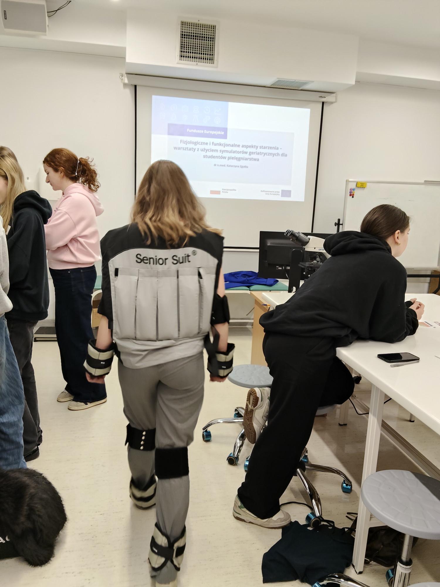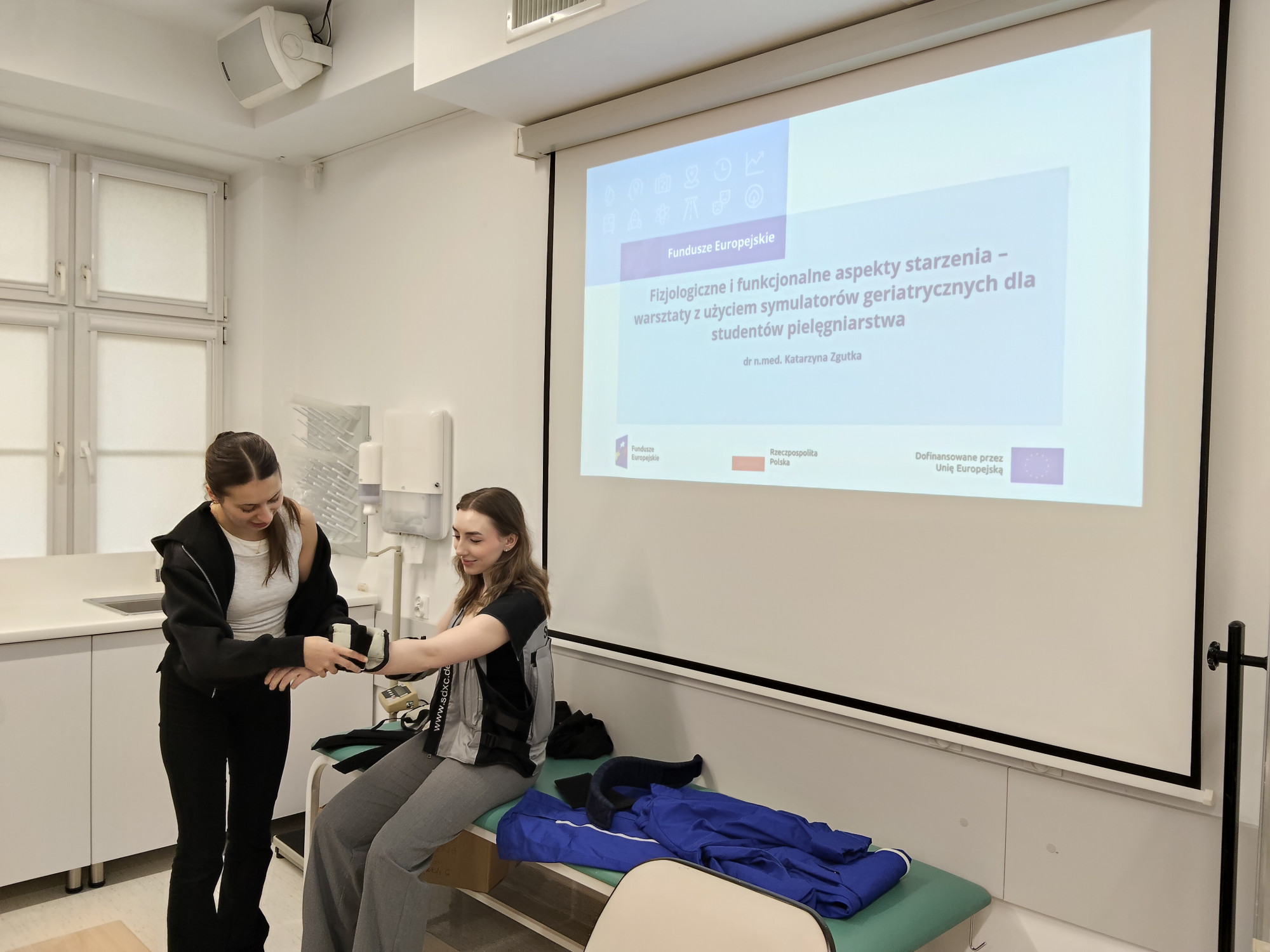 W dniach 26–27 marca w Zakładzie Fizjologii Nauk o Zdrowiu odbyły się spotkania „Fizjologiczne i funkcjonalne aspekty starzenia – warsztaty z użyciem symulatorów geriatrycznych dla studentów pielęgniarstwa”, realizowane w ramach programu Modern Ageing, czyli nowocześnie o starzeniu, FEPZ.05.03-IZ.00-0004/24, dofinansowanego ze środków EFRR w ramach programu Fundusze Europejskie dla Pomorza Zachodniego, Priorytet 5, Fundusze Europejskie na rzecz przyjaznego mieszkankom i mieszkańcom Pomorza Zachodniego, Działanie 5.3, Infrastruktura szkolnictwa wyższego.