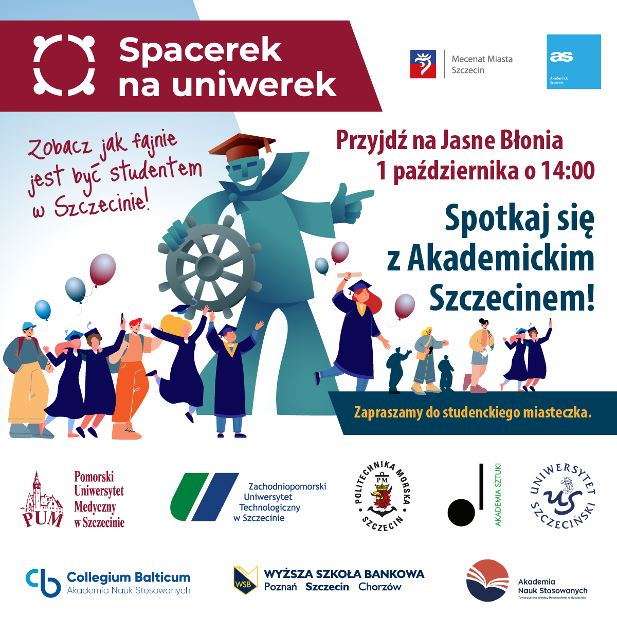 Szczególnie serdecznie zapraszamy młodzież szkół średnich – która już zdecydowała lub dopiero szuka swojego kierunku na przyszłość. Zachęcamy Was – przyjdźcie na spacer z rodzicami, dziadkami, znajomymi i przyjaciółmi. W miasteczku czekają na Was przyszli koledzy z uczelni, a na naszej scenie – artyści! Wystąpią przed Wami Bloco Pomerania, 3-BURSbAnd, Kuba i Kuba oraz Zespół jazzowy Joli Szczepaniak. Do zobaczenia!