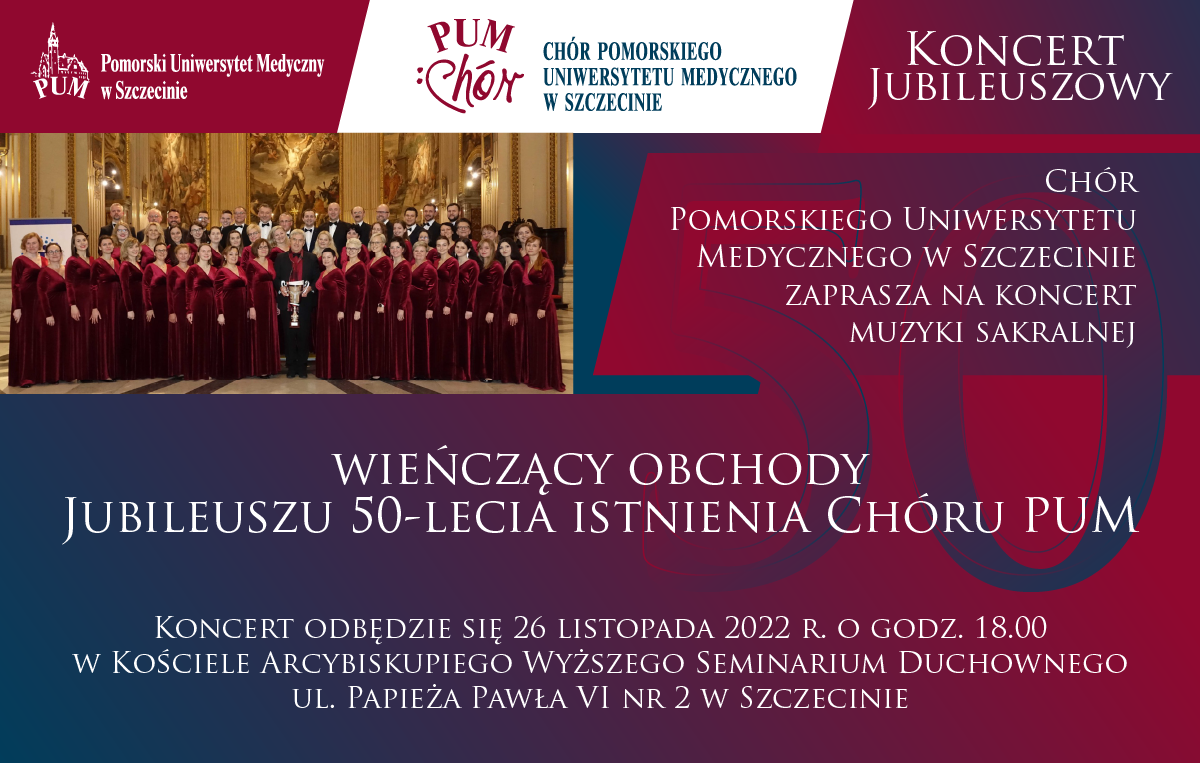 Serdecznie zapraszamy na koncert Chóru Pomorskiego Uniwersytetu Medycznego w Szczecinie wieńczący obchody 50-lecia istnienia zespołu.