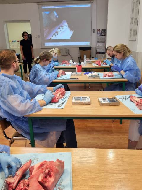 Przyszli dentyści w tej edycji szkolenia dowiedzieli się jak uzyskać podczas leczenia doskonały wynik gojenia. W pierwszej, wykładowej części studenci zapoznali się z zagadnieniami mikrochirurgii jamy ustnej, instrumentarium mikrochirurgicznym, materiałami szewnymi i biologią gojenia ran chirurgicznych. Szczegółowo omówione zostały także trzy najważniejsze etapy minimalnie inwazyjnego leczenia chirurgicznego: projektowanie cięcia, kształtowanie płatów i zakładanie szwów. W części drugiej kursu, podczas pięciogodzinnych warsztatów realizowanych z wykorzystaniem fantomów zwierzęcych, studenci samodzielnie projektowali płaty w zależności od rodzaju przeprowadzanej procedury chirurgicznej, a także doskonalili umiejętność szycia chirurgicznego umożliwiającego gojenie ran bez powikłań. Zapraszamy na kolejne edycje warsztatów!