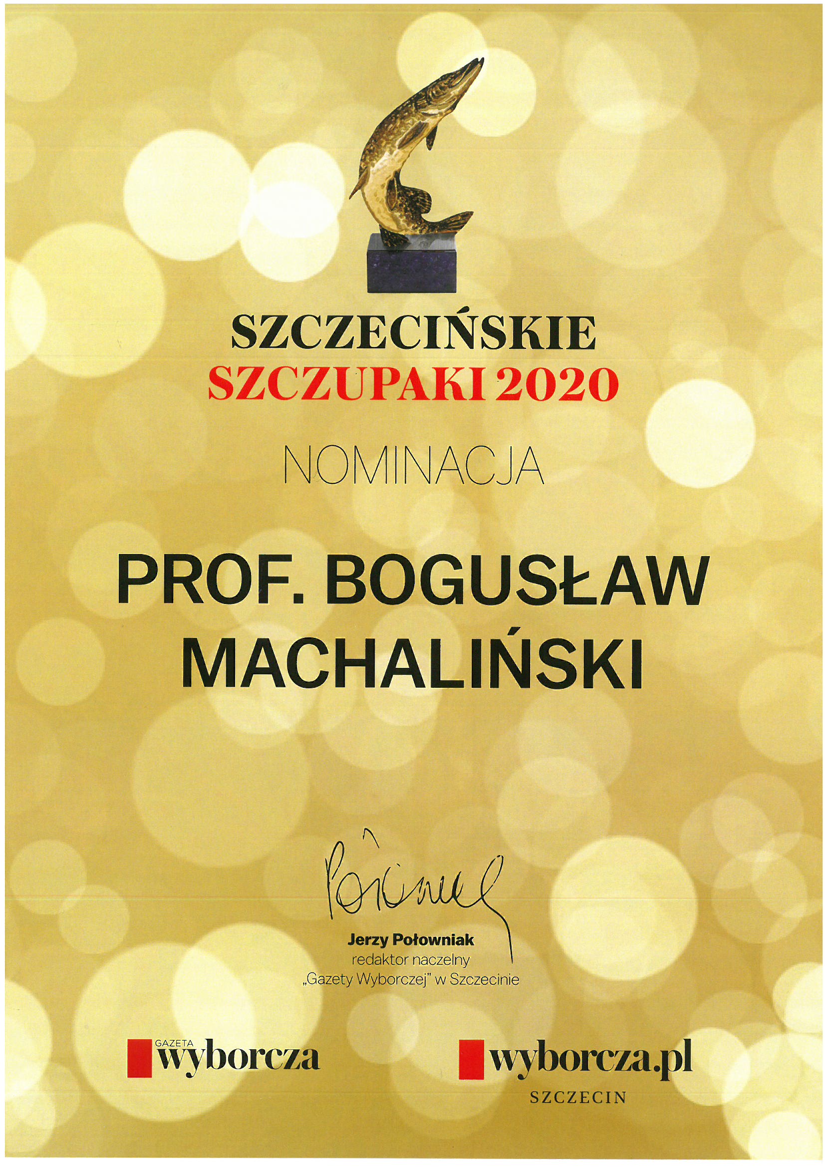 Prof. Bogusław Machaliński znalazł się także w gronie 10 nominowanych do tytułu SZCZECIŃSKIEGO SZCZUPAKA 2020. Tą nagrodą wyróżniane są osoby i instytucje, które w minionym roku osiągnęły wybitne sukcesy i rozsławiły Szczecin, a także są wzorem do naśladowania. Nominację ogłosiła szczecińska redakcja „Gazety Wyborczej” w lutym 2021 r.