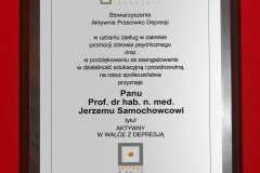 Prof. Samochowiec otrzymał także nagrodę "Aktywny w Walce z Depresją" za szczególne osiągnięcia w promocji zdrowia psychicznego i zaangażowanie w działalność edukacyjną i prozdrowotną. Odebrał ją z rąk przedstawicieli STOWARZYSZENIA AKTYWNIE PRZECIWKO DEPRESJI w trakcie Dwunastego Koncertu Pogodnego w Teatrze Polonia w Warszawie.