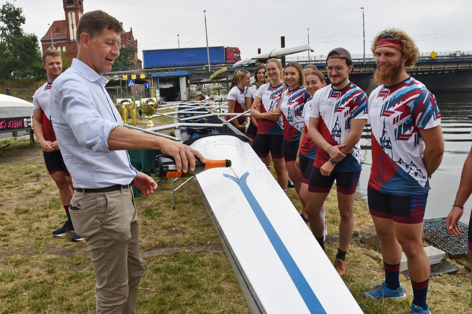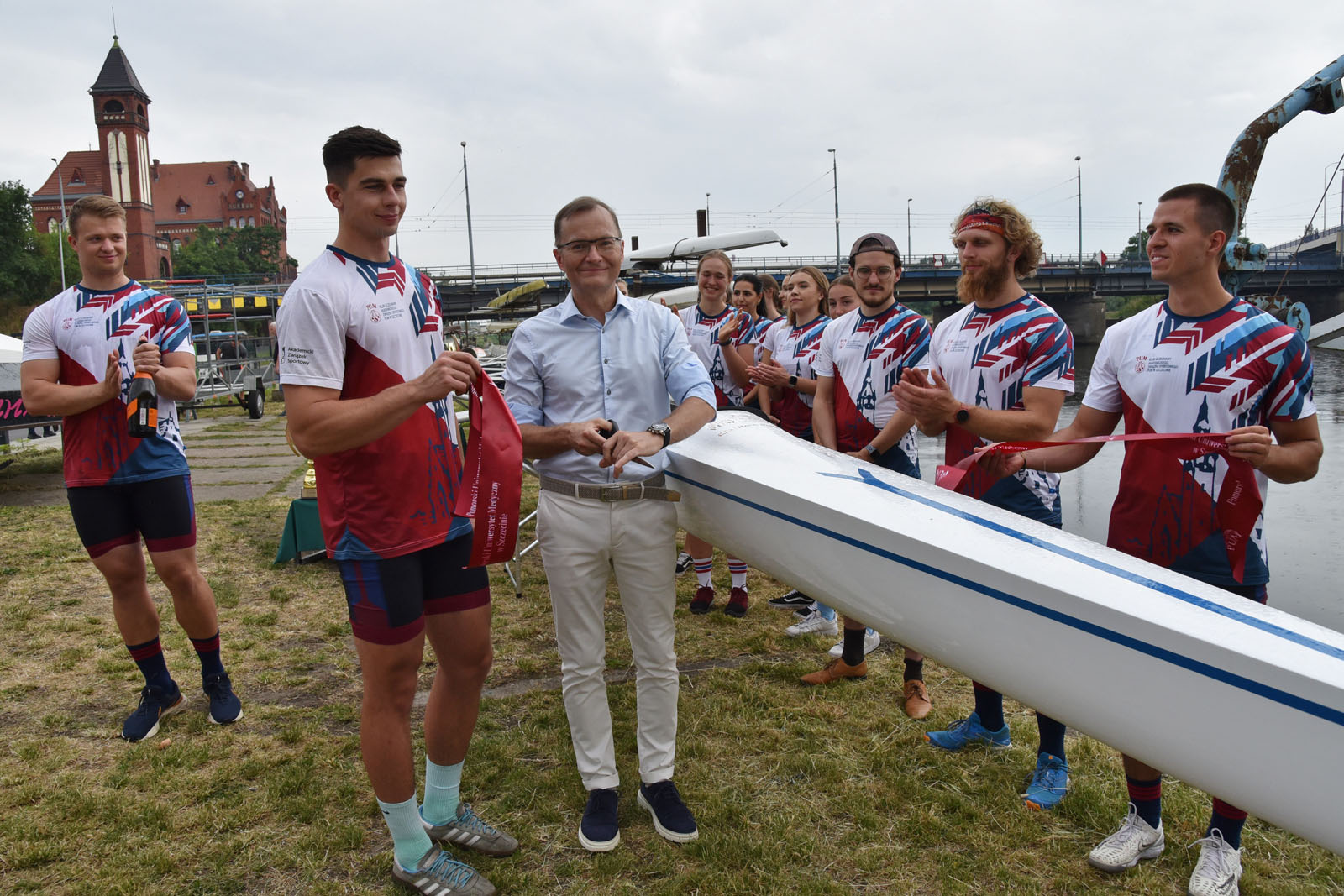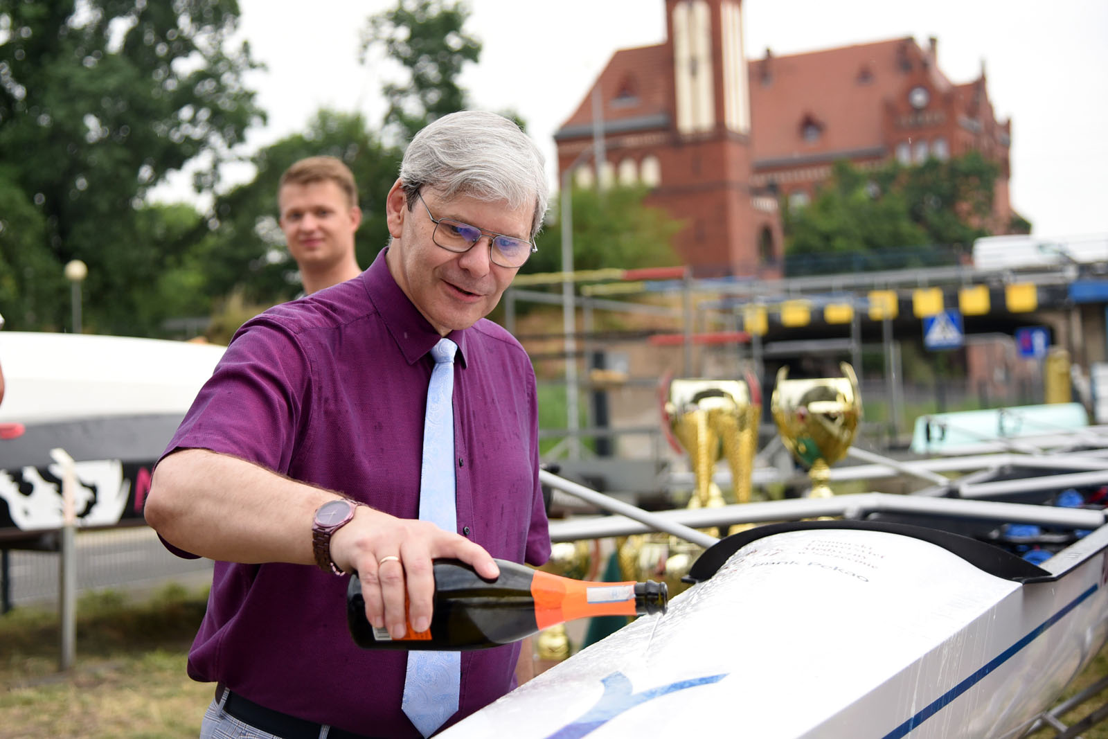 Symbolicznego przecięcia wstęgi dokonał rektor PUM prof. Bogusław Machaliński, natomiast gest ochrzczenia łodzi przypadł pani pani dyr. Koroch. Towarzyszył Jej kapitan osady męskiej Oliwier Huzarski. Do życzeń sukcesów naszym zawodnikom dołączyli także prorektorzy prof. Leszek Domański i prof. Dariusz Chlubek. Padły m.in. słowa podziękowań na ręce mgr. Jana Jelca – twórcy osiągnięć naszych osad i zapewnienie z Jego strony o dalszym, wytrwałym zmierzaniu ku kolejnym sukcesom. Wydarzeniu towarzyszyła także prezentacja trofeów wioślarskich, nie mających precedensu w historii naszej uczelni, ani odpowiednika w dokonaniach innych uczelni szczecińskich.