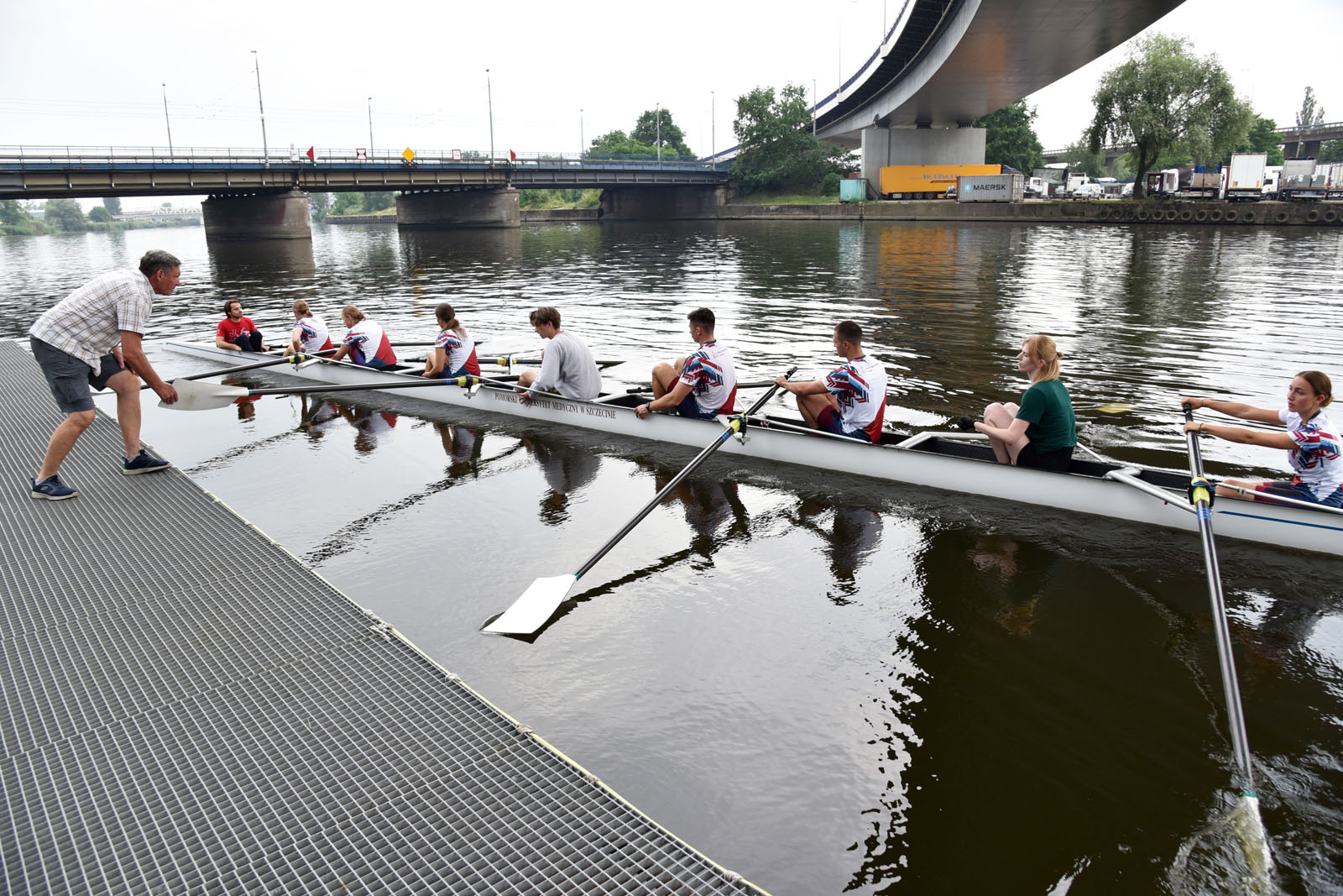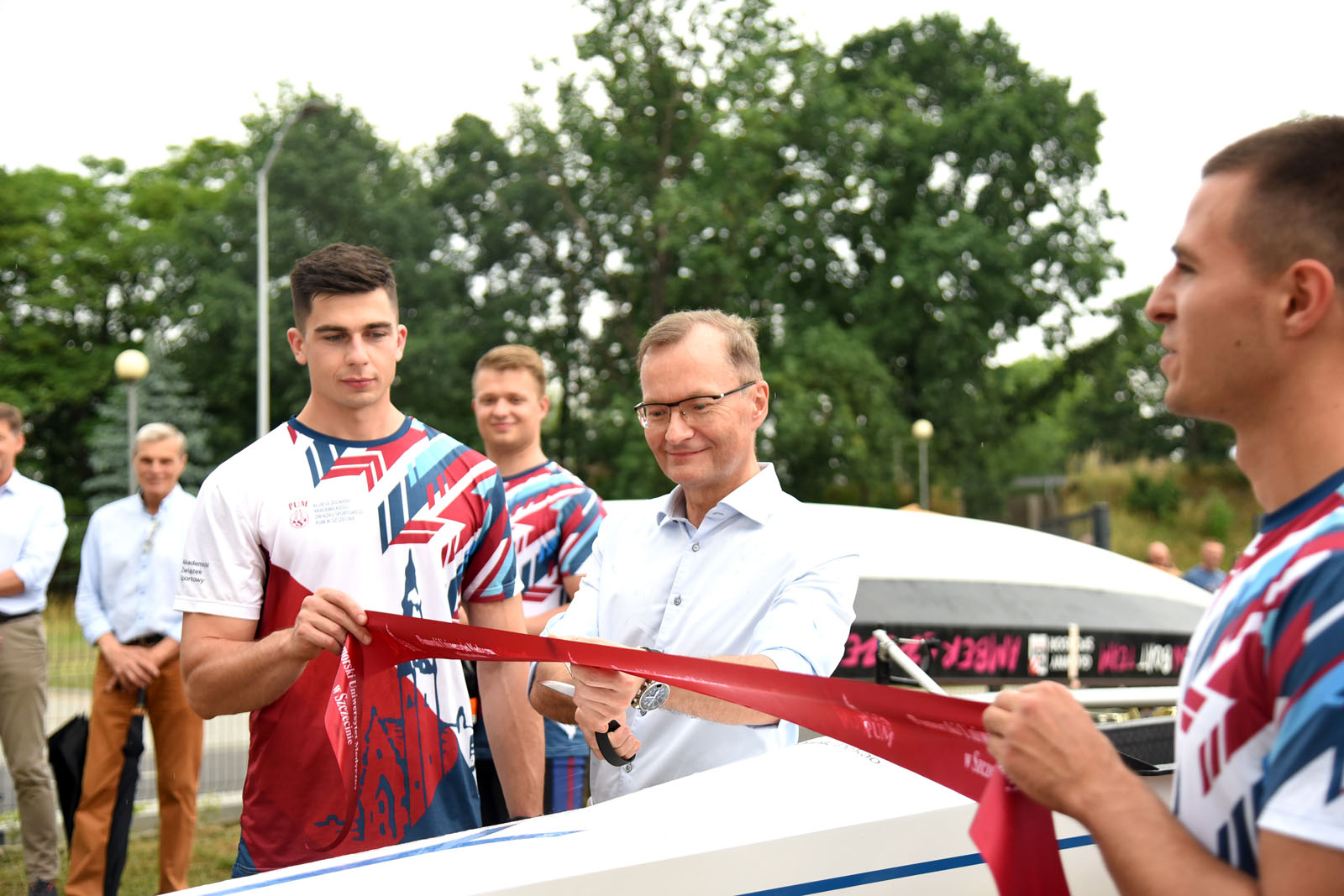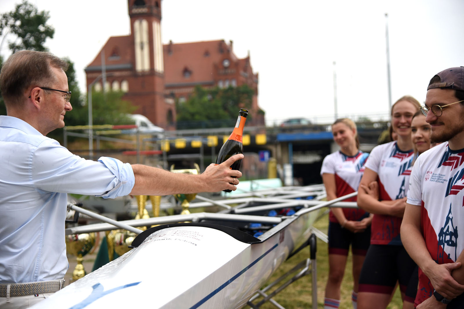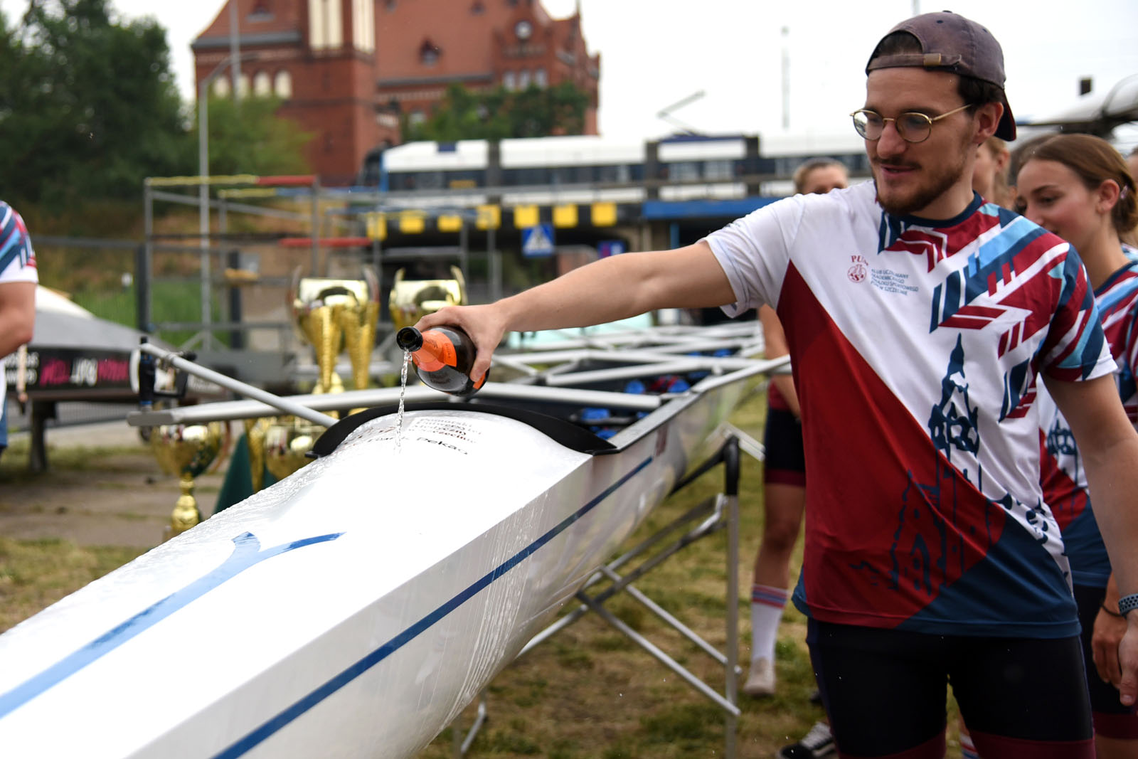Symbolicznego przecięcia wstęgi dokonał rektor PUM prof. Bogusław Machaliński, natomiast gest ochrzczenia łodzi przypadł pani pani dyr. Koroch. Towarzyszył Jej kapitan osady męskiej Oliwier Huzarski. Do życzeń sukcesów naszym zawodnikom dołączyli także prorektorzy prof. Leszek Domański i prof. Dariusz Chlubek. Padły m.in. słowa podziękowań na ręce mgr. Jana Jelca – twórcy osiągnięć naszych osad i zapewnienie z Jego strony o dalszym, wytrwałym zmierzaniu ku kolejnym sukcesom. Wydarzeniu towarzyszyła także prezentacja trofeów wioślarskich, nie mających precedensu w historii naszej uczelni, ani odpowiednika w dokonaniach innych uczelni szczecińskich.