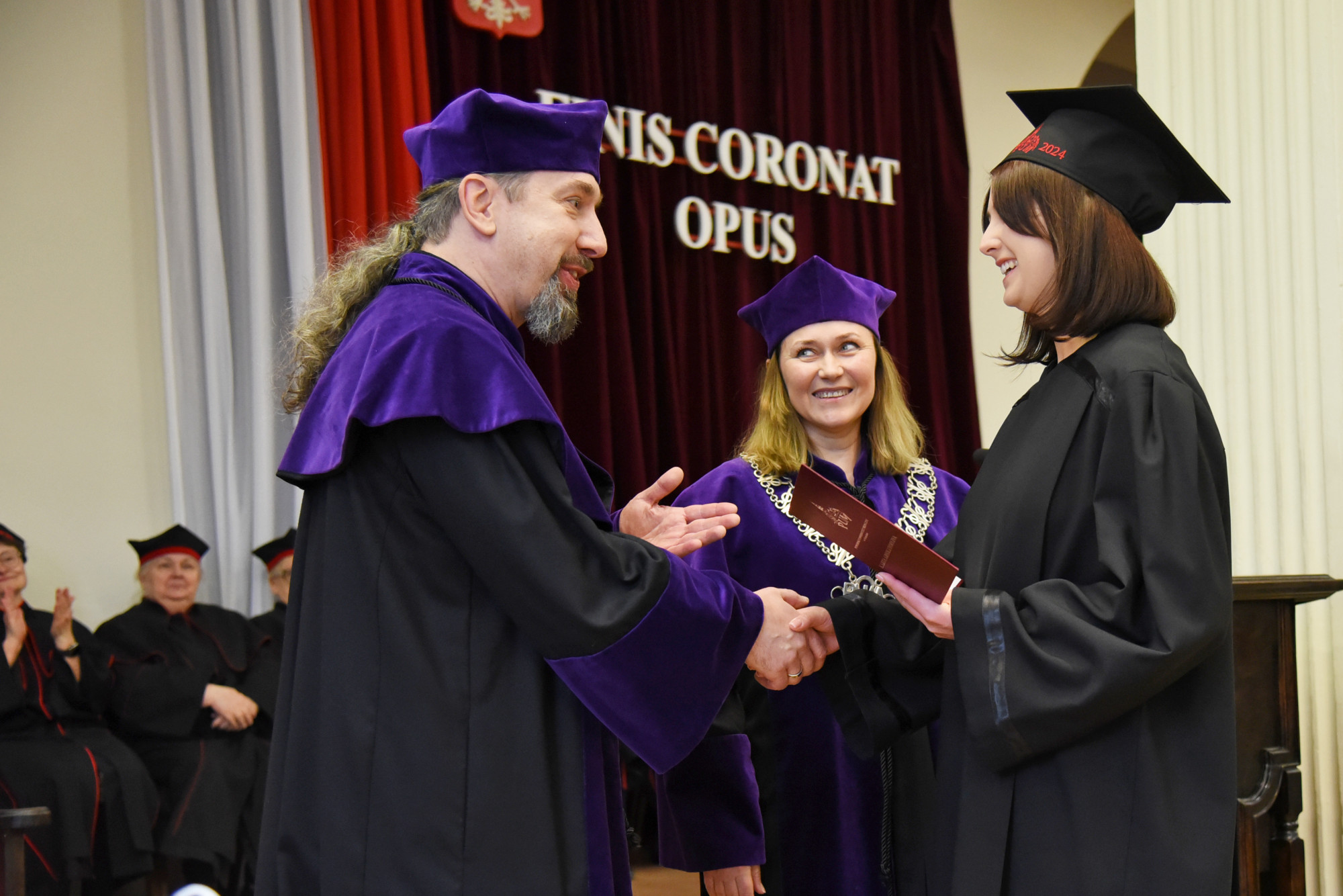 Wzruszające chwile towarzyszyły uczestnikom szczególnie podczas składania uroczystego przyrzeczenia oraz odbierania kart absolutoryjnych, które wręczała Dziekan WFBMiML w towarzystwie Prodziekana prof. dr. hab. Mateusza Kurzawskiego.