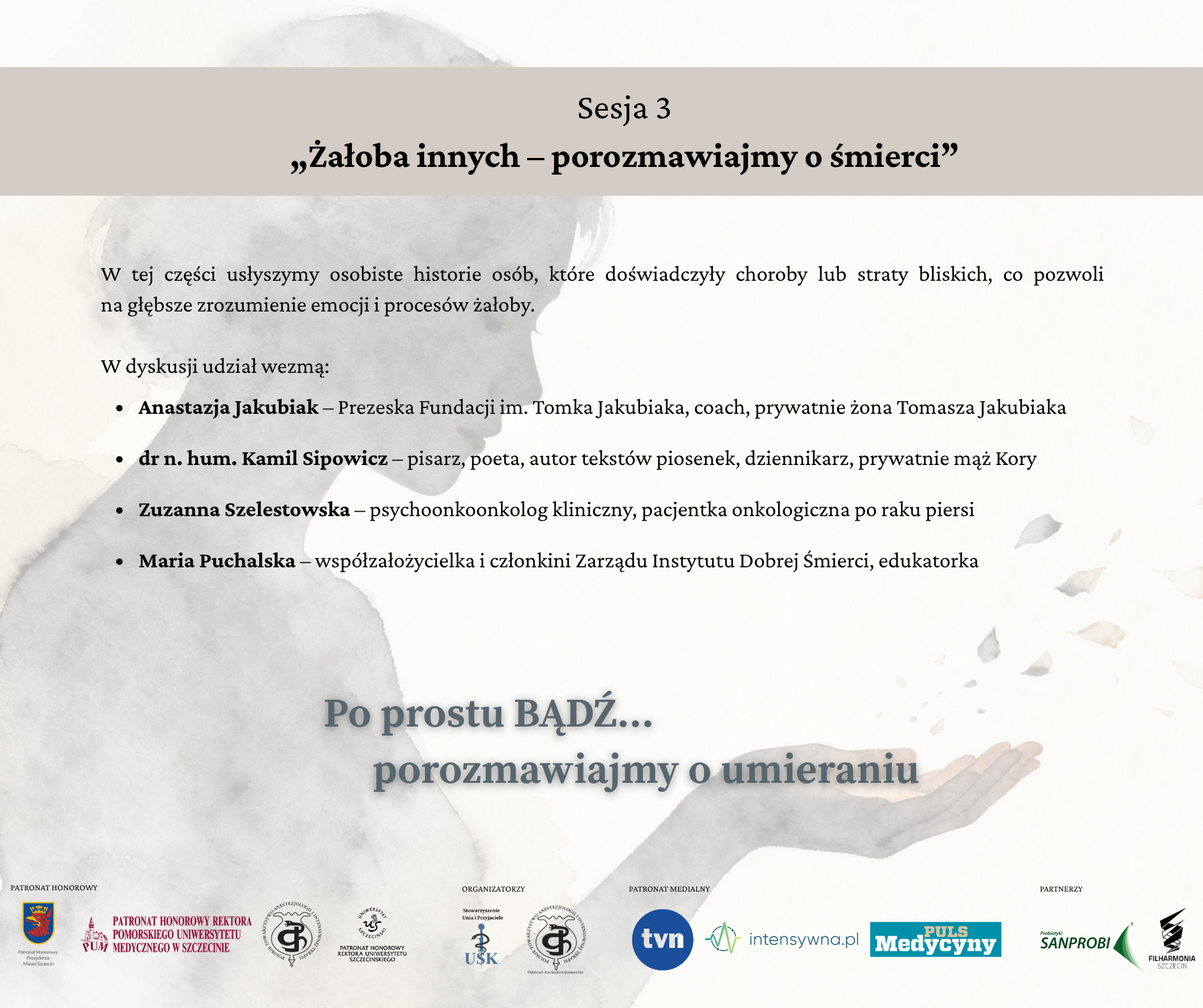 Śmierć, odchodzenie i żałoba to tematy, o których często trudno rozmawiać. Jak jednak mówić o nich z bliskimi? Jak wspierać osoby w żałobie i jak samemu radzić sobie ze stratą? Odpowiedzi na te pytania poszukają uczestnicy konferencji „Po prostu BĄDŹ… porozmawiajmy o umieraniu”, która odbędzie się 15 listopada 2025 roku o godz. 9:00 w Filharmonii im. M. Karłowicza w Szczecinie (sala kameralna).