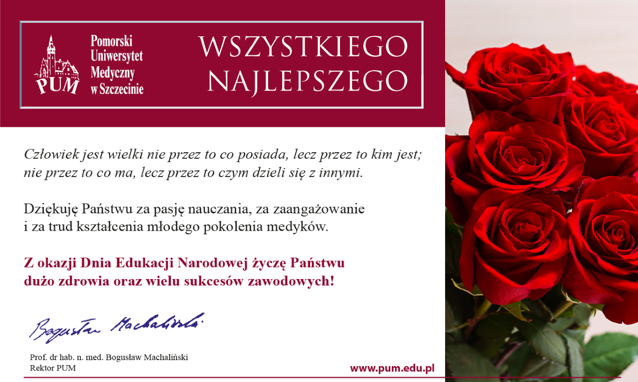 Z okazji Dnia Edukacji Narodowej, w imieniu JM Rektora PUM prof. Bogusława Machalińskiego, przekazujemy całej społeczności akademickiej najserdeczniejsze życzenia i podziękowania za trud edukacji. Szczególne słowa uznania składamy na ręce dydaktyków Pomorskiego Uniwersytetu Medycznego w Szczecinie.