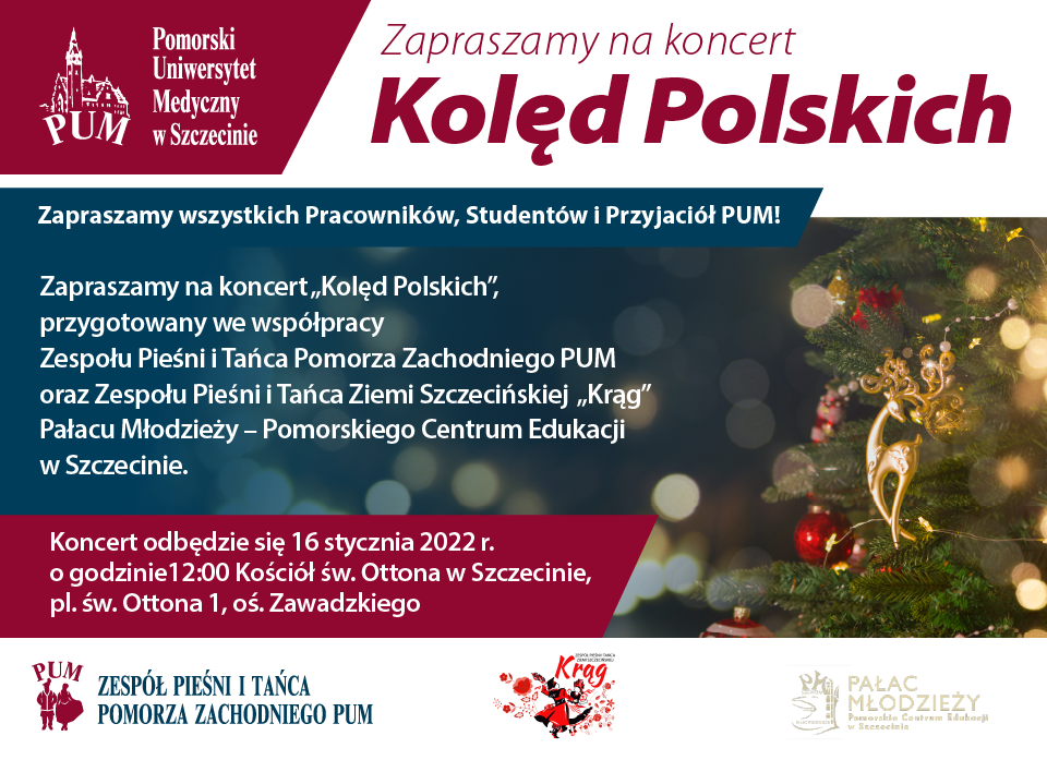 Drodzy pracownicy, studenci i przyjaciele PUM, serdecznie zapraszamy na noworoczny koncert Kolęd Polskich w wykonaniu m.in. Zespołu Pieśni i Tańca Pomorza Zachodniego PUM.
