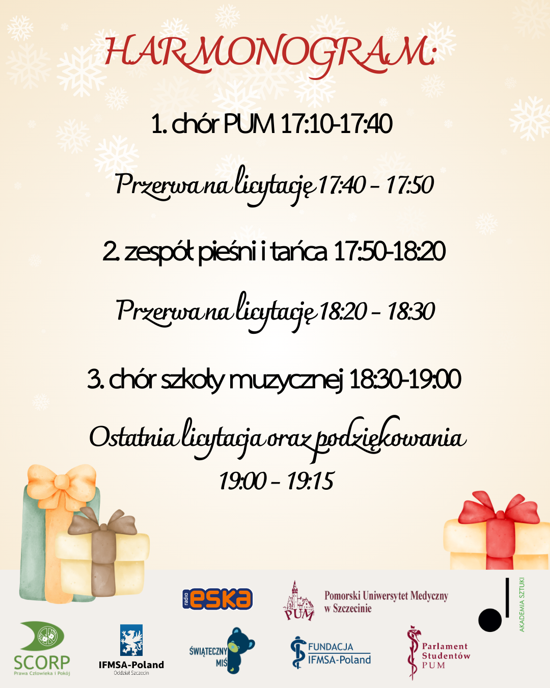 IFMSA-Poland oddział Szczecin wraz z Parlamentem Studentów Pomorskiego Uniwersytetu Medycznego w Szczecinie po raz kolejny organizują Koncert Charytatywny wraz z licytacją fantów. Zebrane środki zostaną przeznaczone na zakup prezentów dla dzieci, które podczas Świąt Bożego Narodzenia zmuszone będą pozostać w szczecińskich oddziałach szpitalnych i nie spędzą tego magicznego czasu z rodzinami w domu.