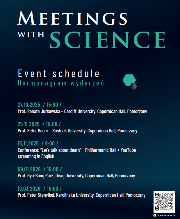 „Spotkania z nauką” to cykl poza programowych prezentacji uznanych na świecie naukowców, dzięki którym studenci PUM, a także innych szczecińskich uczelni, mogą poszerzać swoją wiedzę, poznawać fascynujące zagadnienia z różnych dziedzin nauki i spotykać się z ekspertami, którzy dzielą się swoją pasją, wiedzą i doświadczeniem.